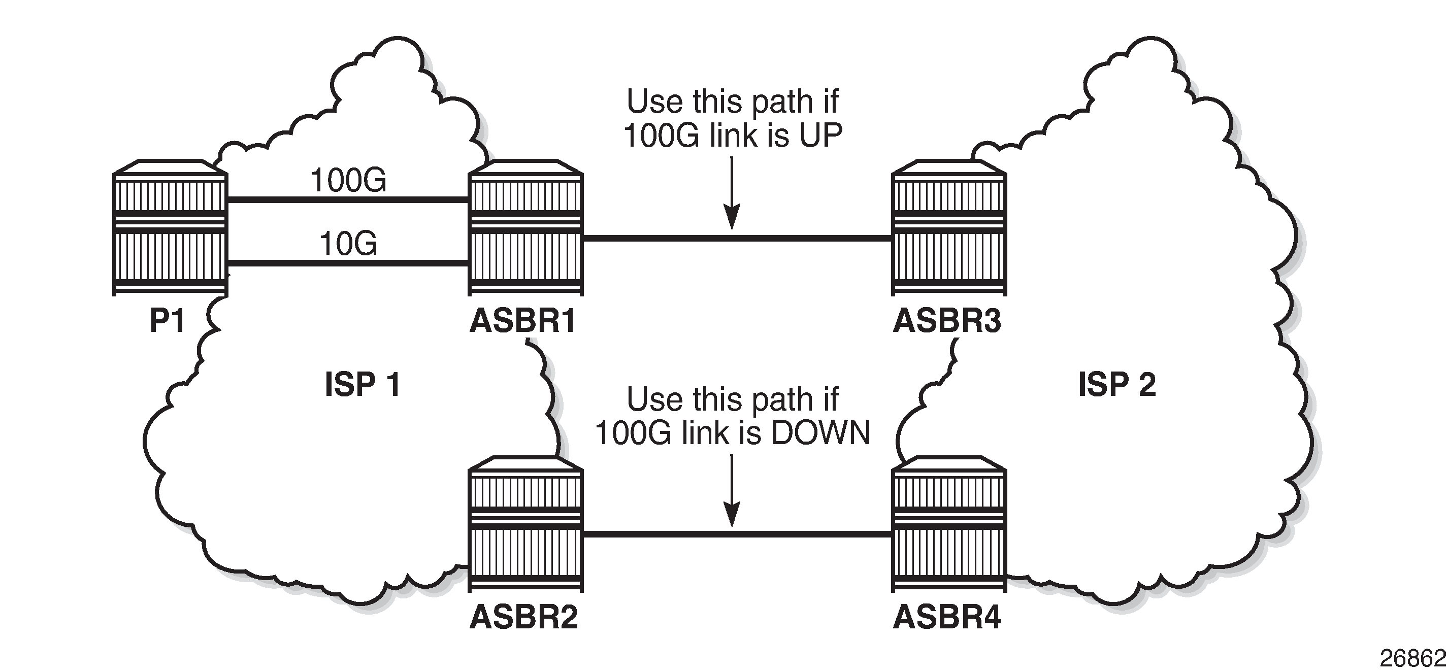 ISP 1 and ISP 2 have two peering points; a first between ASBR1 and ASBR3, and a second between ASBR2 and ASBR4. For redundancy, ISP 1 has two links between ASBR1 and the internal P1 router, one with 100 Gb/s and the other with 10 Gb/s capacity. According to the service agreement, ISP 1 instructs ISP 2 to send traffic using the upper path (between ASBR1 and ASBR3) only if the 100 Gb/s link between P1 and ASBR1 is up. If this is not the case, ISP 2 uses the lower path.