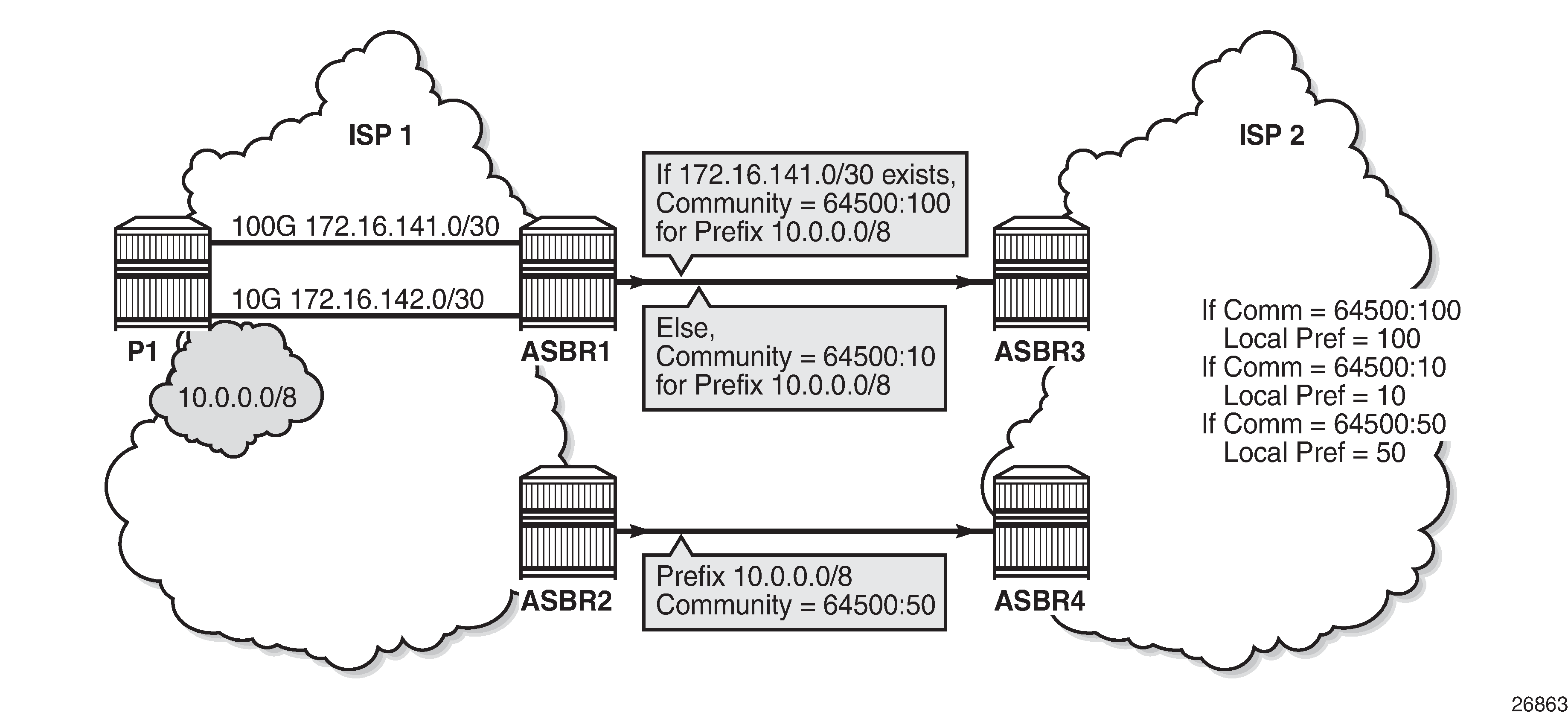If the 100G interface goes down, the prefix 172.16.141.0/30 is withdrawn from the route table and, as a result, ASBR1 starts advertising 10.0.0.0/8 with a community value 64500:10. ASBR3 and ASBR4 adjust the local preference value for ASBR1 to 10 and, therefore, ASBR4 becomes the preferred exit point for routers in ISP 2.