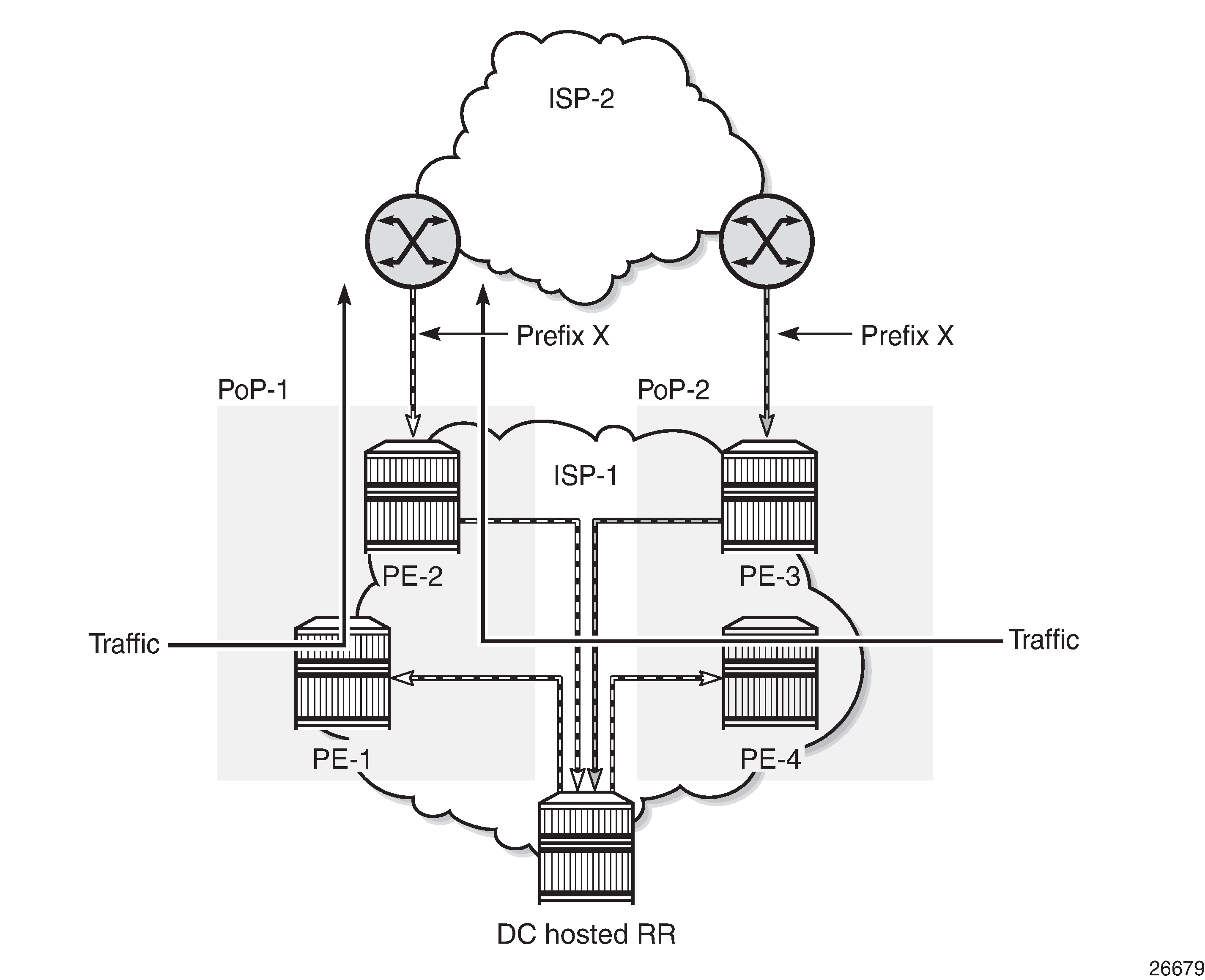 When a BGP route reflector receives multiple paths for the same IP destination, it normally selects and reflects a single best path in its routing domain to all clients in that domain, based on its own location in the domain. In Centralized route reflection, the centralized route reflector RR for ISP-1 is located in the datacenter (DC), and receives prefix X from ISP-2 through PE-2 in point of presence PoP-1 and also through PE-3 in PoP-2. RR selects and reflects PE-2 as the best path to the remaining route reflector clients because RR is closer to PoP-1 than it is to PoP-2, so the traffic to destination X flows as indicated. Therefore, sending traffic to another autonomous system (AS) through the closest possible exit point from the local AS, known as hot-potato routing, cannot be achieved.