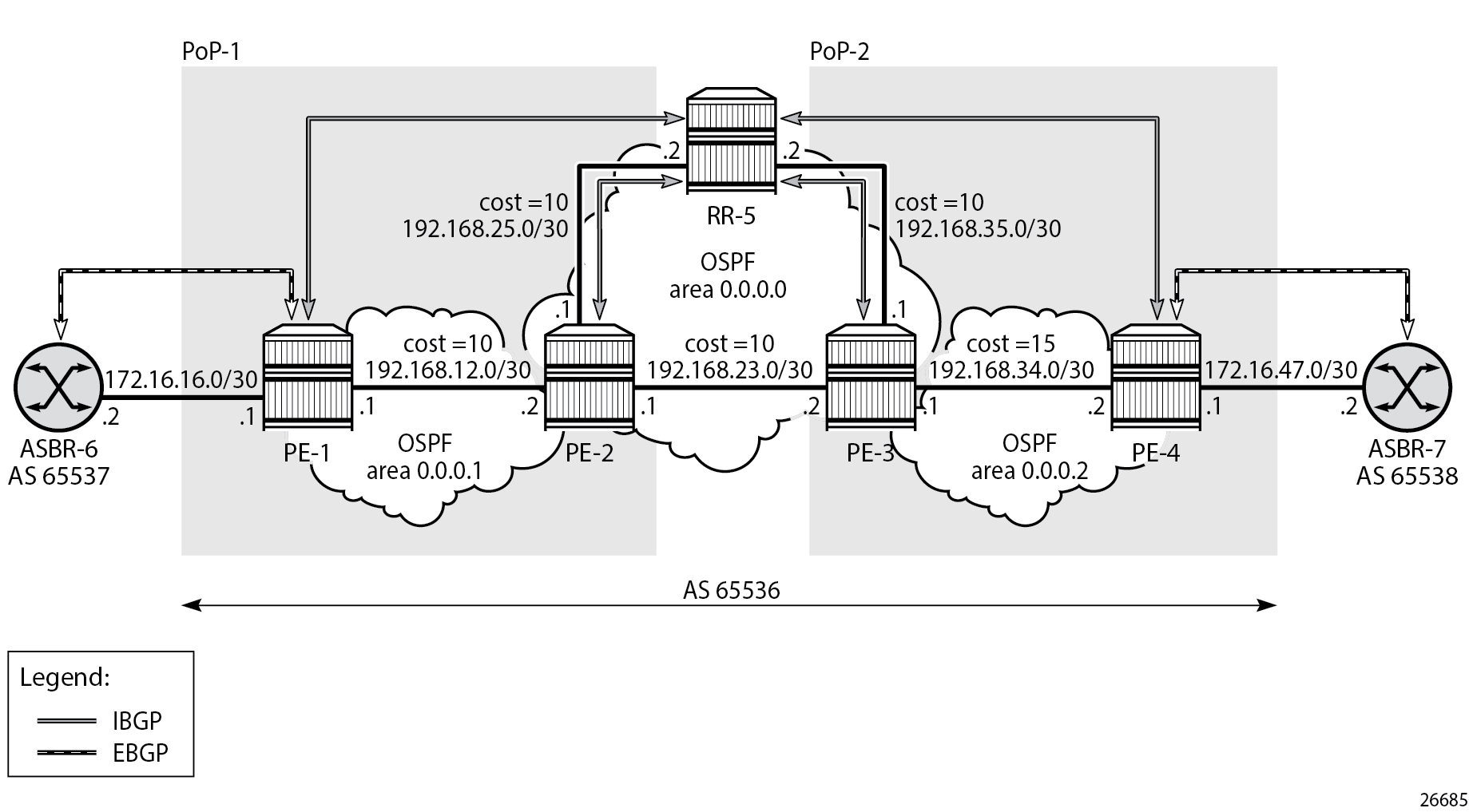 OSPF as IGP on all interfaces within AS 65536, with multiple non-backbone areas (alternatively, IS-IS can be used), and traffic engineering enabled
