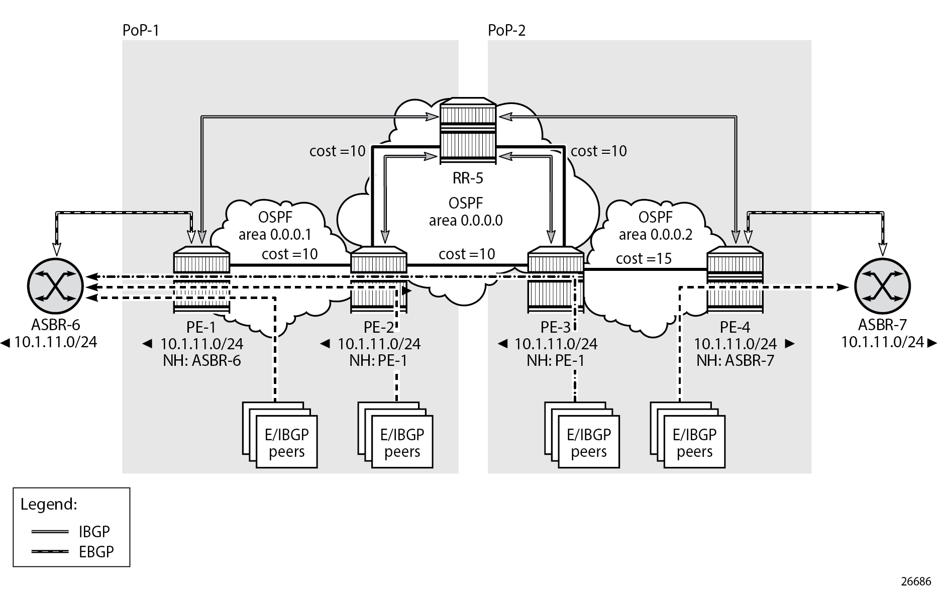 Hot-potato routing can be achieved using a route reflector selecting and reflecting multiple best paths, for different subdomains and from the point of view of a client in a subdomain, as outlined in RFC 9107 BGP optimal route reflection (ORR), and requires the route reflector to know the topology of each subdomain. In Centralized route reflection with ORR, the route reflector calculates the best path for PoP-1 and reflects that to the clients in PoP-1 (PE-1), and it also calculates the best path for PoP-2 and reflects that to the clients in PoP-2 (PE-4).