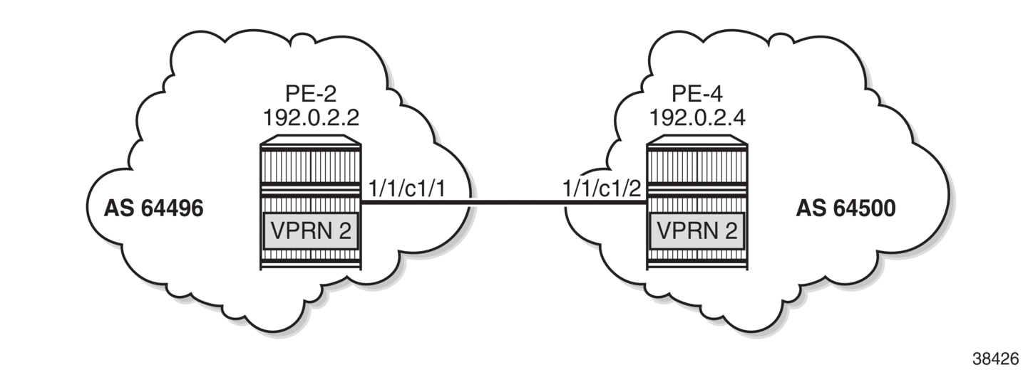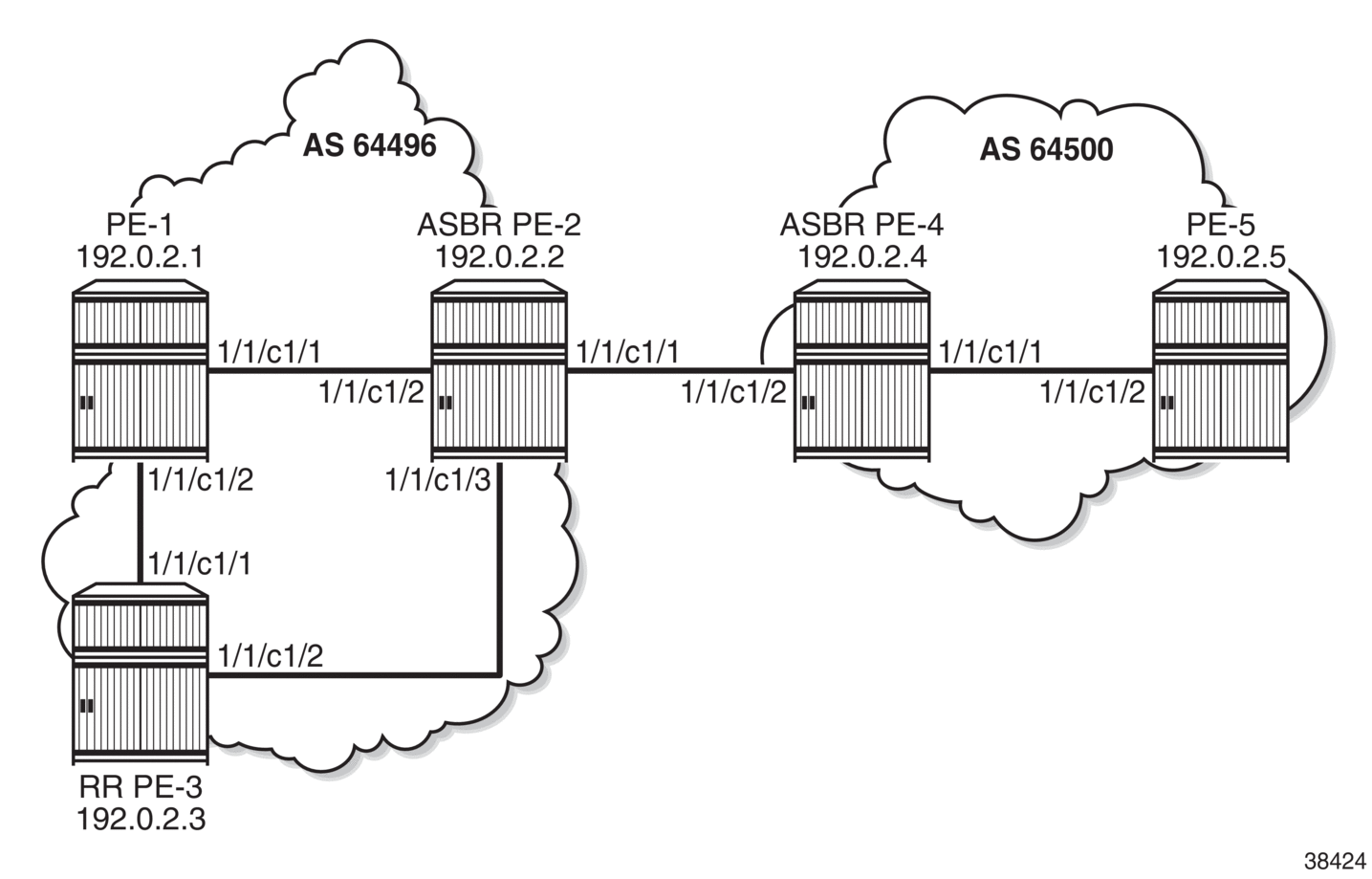 VPRN 3 - inter-AS VPRN model C shows the example topology with RR PE-3 in AS 64496. VPRN 3 is configured on PE-1 and PE-5.