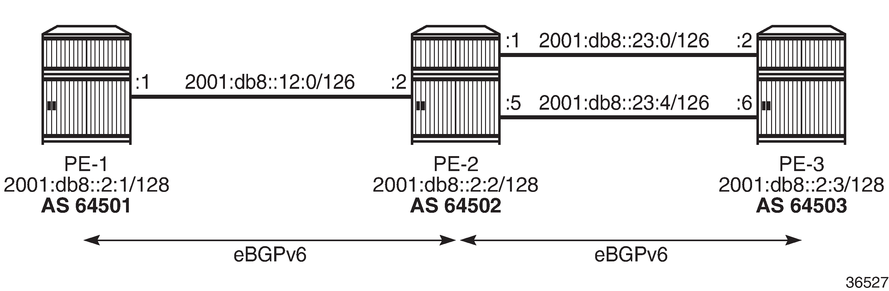 Example topology with IPv6 interfaces shows the example topology with three nodes with IPv6-only interfaces in different Autonomous Systems (ASs).