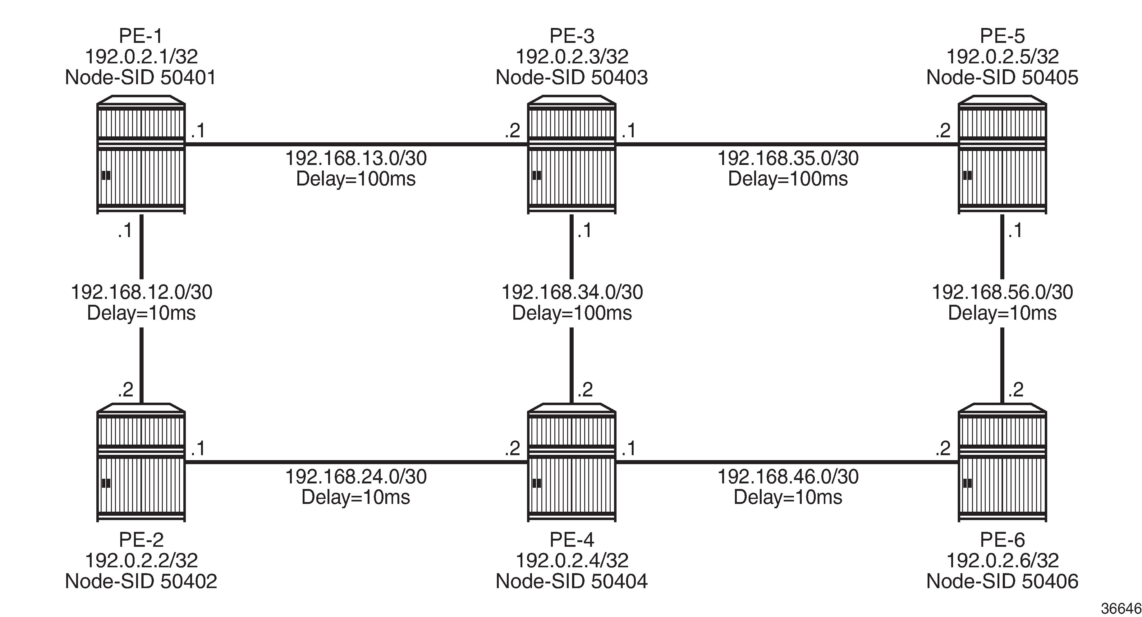 In addition to the default algorithm 0 (metric-based SPF), all routers participate in Flex-Algorithm 130 with FAD {calc-type=SPF, metric=delay, constraints=none}. Router PE-3 advertises prefix 192.0.2.3/32 with Prefix SID {index=3, algorithm=0} and Prefix SID {index=303, algorithm=130}. Router PE-5 has an SR-TE LSP provisioned with a destination of PE-3 (192.0.2.3) and a top (active) label of 1003. As a result, it is associated with algorithm 0 and uses the shortest path IGP metric PE-5-PE-1-PE-2-PE-3 to reach its destination. Router PE-5 is also provisioned with a second SR-TE LSP, again with a destination of PE-3 (192.0.2.3), but this time with a top (active) label of 1303. This second LSP is associated with Flex-Algorithm 130 and uses the shortest path delay metric PE-5-PE-4-PE-3 to reach its destination.