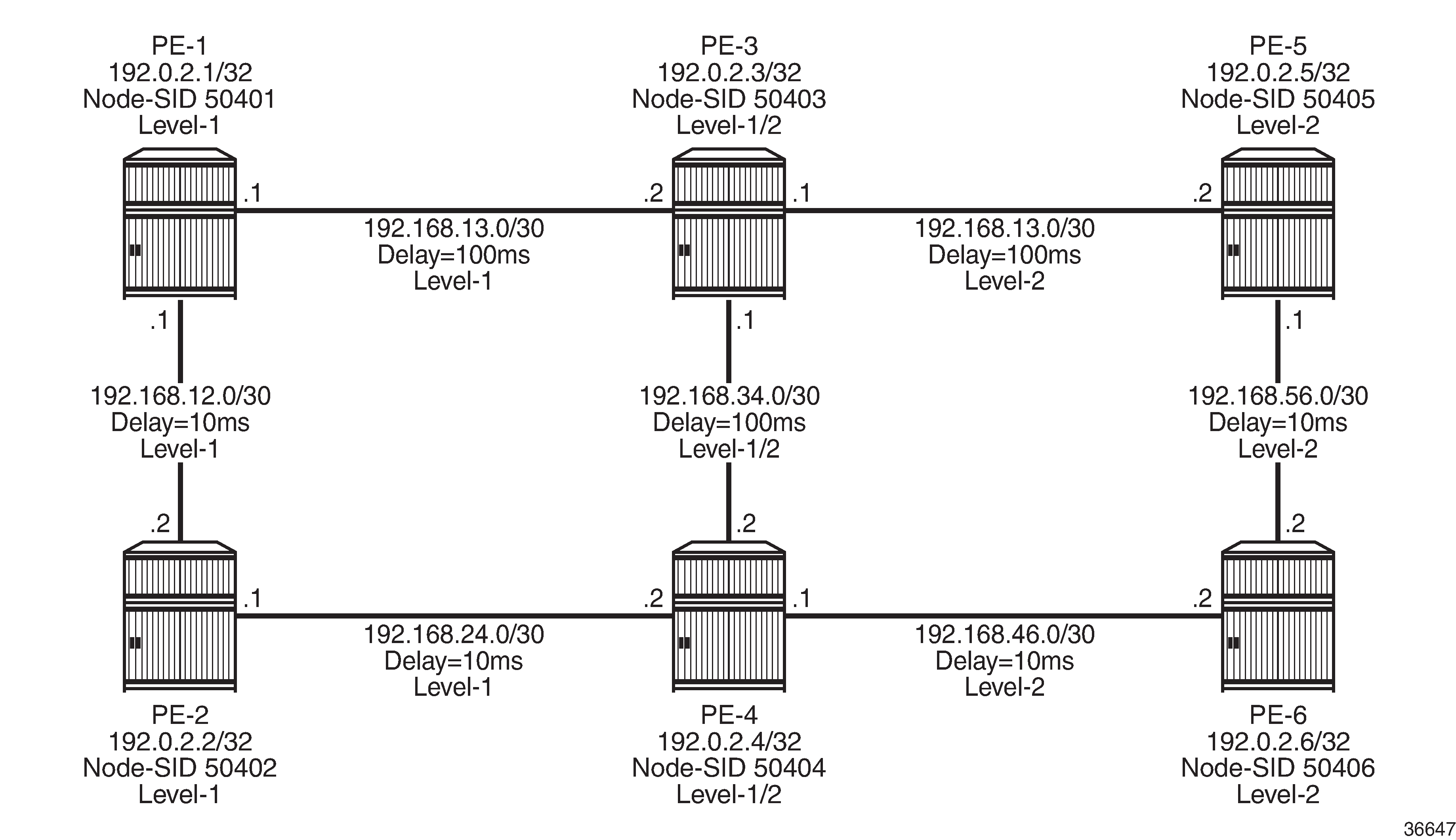 To validate the use of Flex-Algorithm in an inter-area environment, the example topology in Example topology with modified IS-IS Level-1/2 capabilities is modified such that PE-1 and PE-2 are IS-IS Level-1 routers, while PE-3 and PE-4 are IS-IS Level-1/2 routers. PE-5 and PE-6 remain Level-2 only routers.