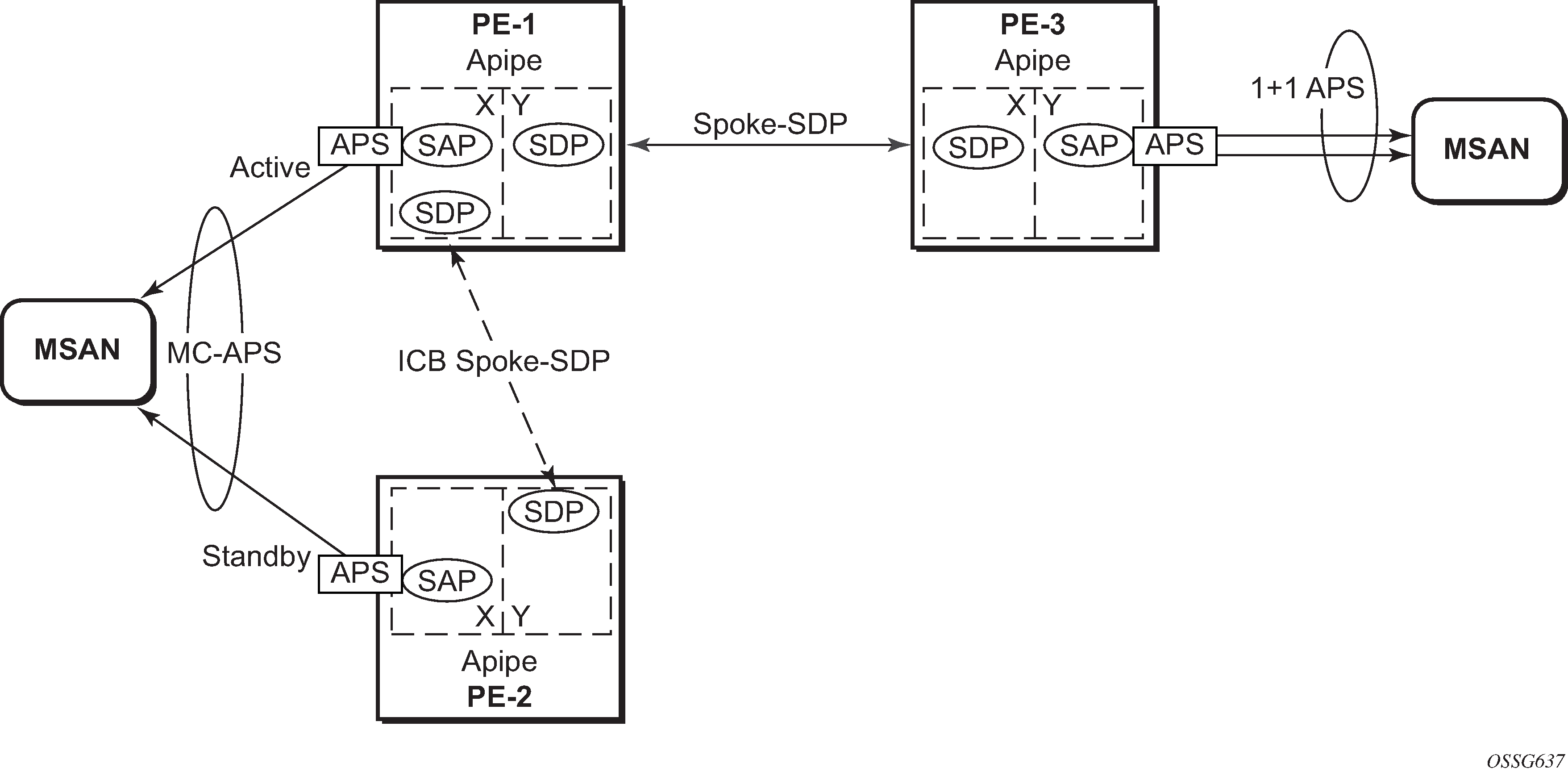 Configuring Inter-Chassis Backup (ICB) is optional. It can reduce traffic impact by forwarding traffic on ICB spoke SDPs during MC-APS switchover. The ICB spoke SDP cannot be added to the endpoint if the SAP is not part of an MC-APS (or MC-LAG) instance. Conversely, a SAP which is not part of a MC-APS (or MC-LAG) instance cannot be added to an endpoint which already has an ICB spoke SDP. Forwarding between ICBs is blocked on the same node. The user has to explicitly indicate the spoke SDP is actually an ICB at creation time. Figure 5 shows some setup examples where ICBs are required.