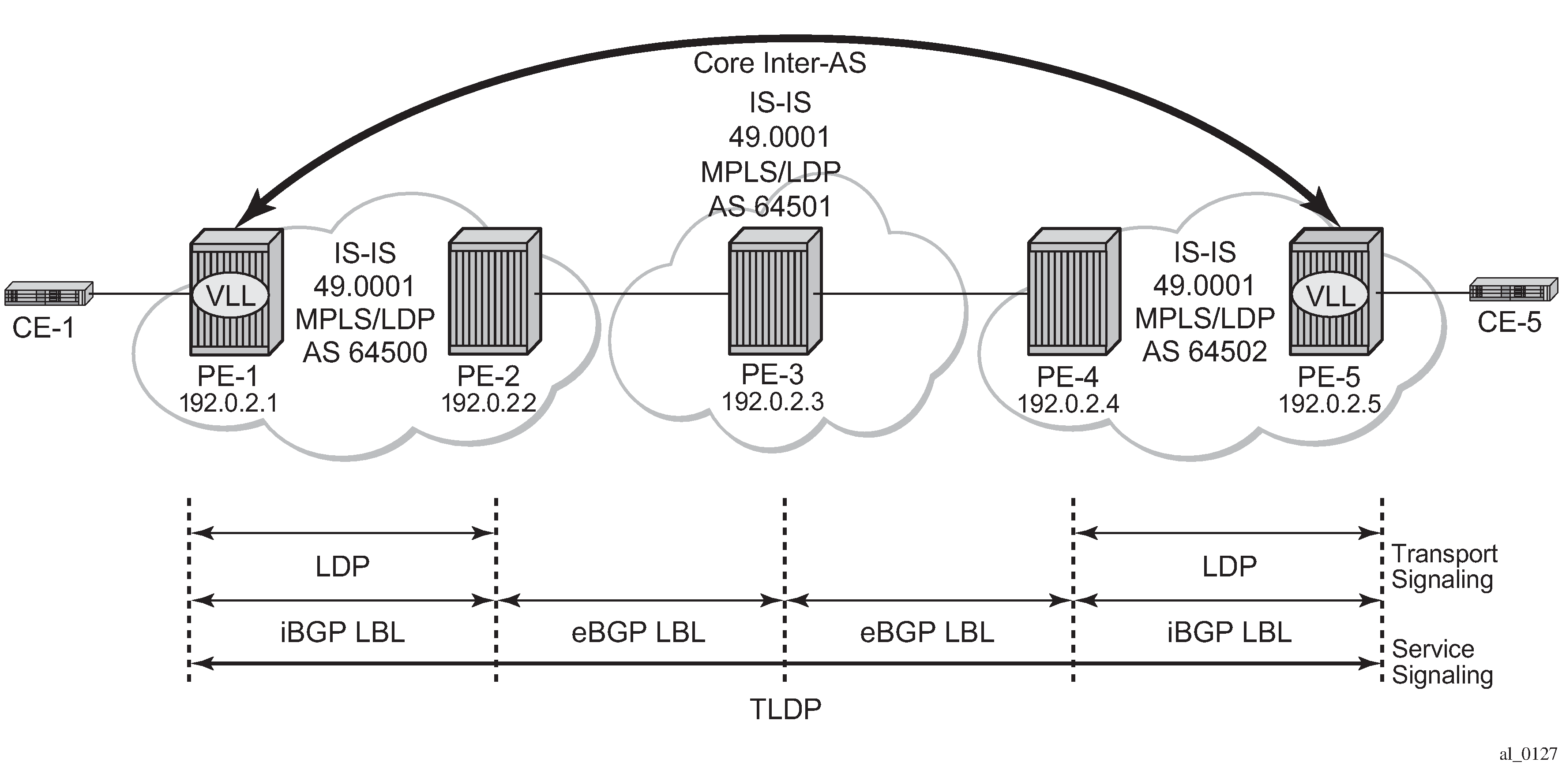 A BGP tunnel must be established between PE-1 and PE-5, therefore, labeled BGP routes must be exchanged for prefixes 192.0.2.1/32 and 192.0.2.5/32 across the ASs. The following shows the BGP configuration — iBGP and eBGP — required for the PE routers to implement an Inter-AS VLL.