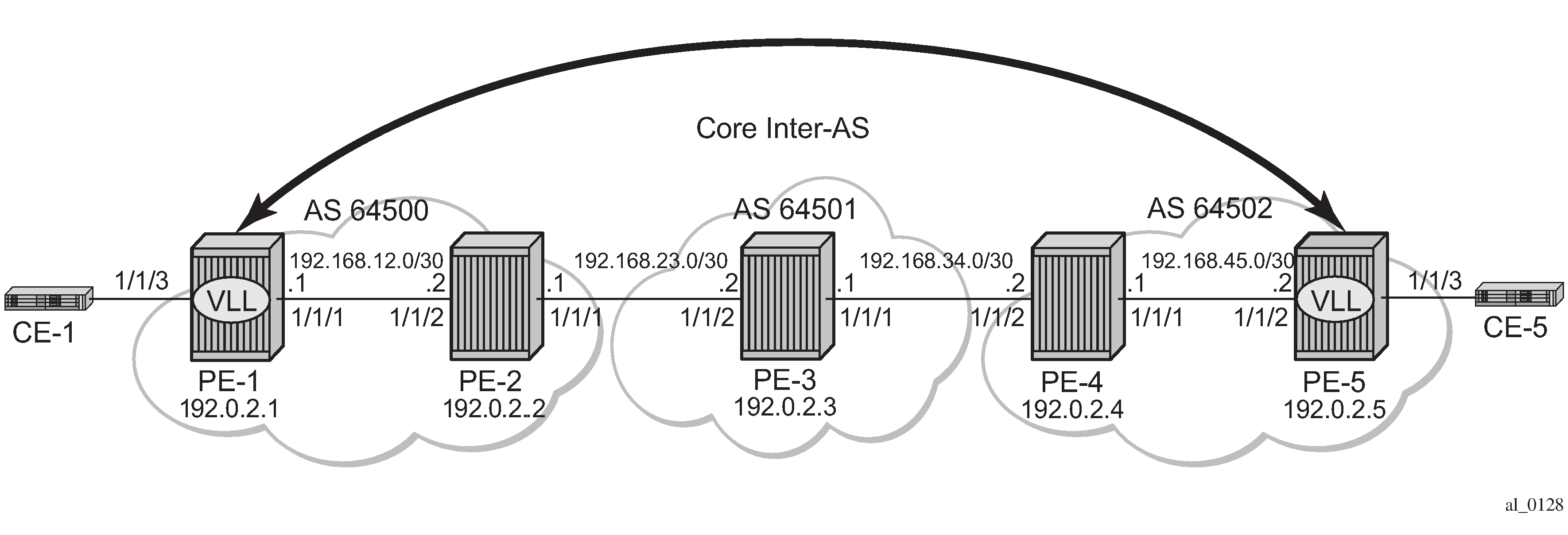 The ASBRs PE-2, PE-3, and PE-4 will swap the BGP labels. PE-3 will advertise the labeled BGP routes learned from AS 64500 to AS 64502 and vice versa and the ASBRs will advertise these labeled routes for remote PE prefixes to their BGP peers. Eventually, PE-1 will have learned a labeled BGP route for prefix 192.0.2.5/32 and PE-5 will have learned a labeled BGP route for prefix 192.0.2.1/32 and a VLL Epipe can be established between PE-1 and PE-5.