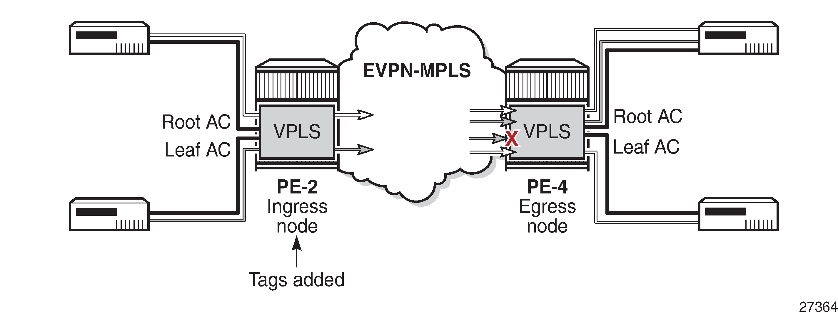 The E-Tree implementation is based on RFC 7796 and is supported for unicast and broadcast, unknown unicast, and multicast (BUM) traffic. Interfaces can be defined as root attachment circuit (AC) or leaf AC, or both, as described in Interfaces in E-Tree . A VPLS E-Tree can have multiple root ACs. Access and network interfaces are both supported on SAPs and SDP bindings.