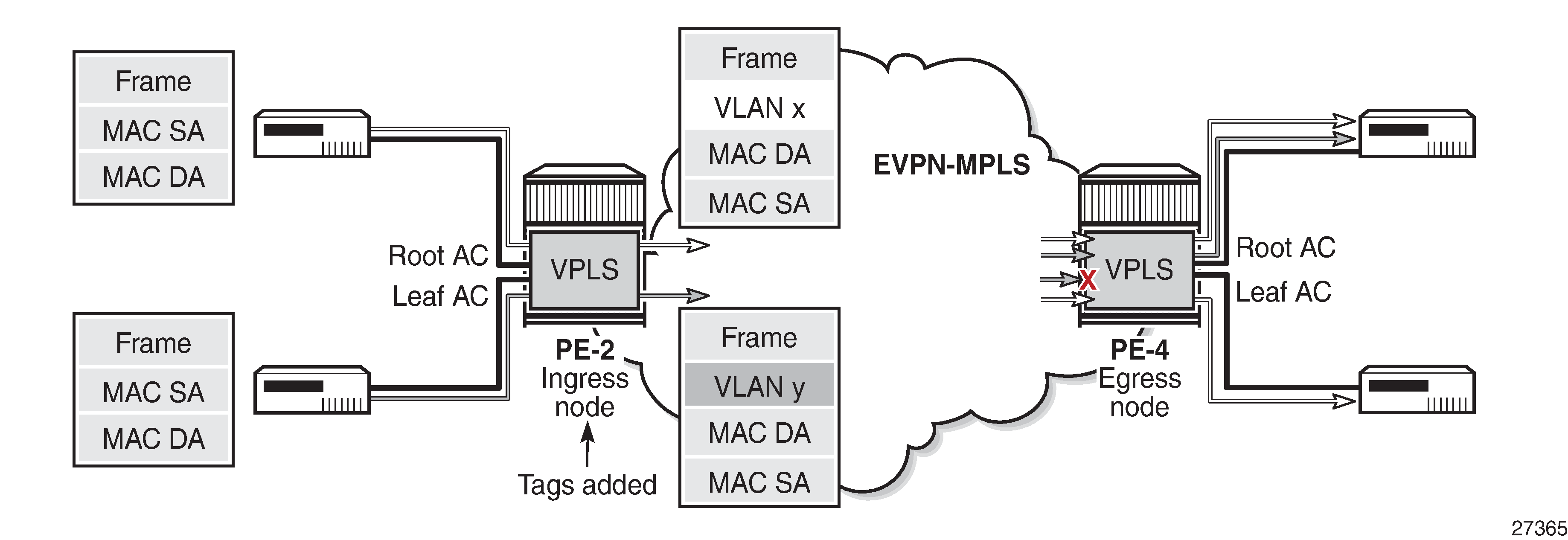 For dot1q/qinq-based L2 services, a VLAN tag with VID x is added for root and VID y for leaf. Frames with VID x are forwarded to any type of AC, while frames with VID y are only forwarded to root ACs at the remote node, as shown in VLAN Tags Added by Ingress Node and Filtered by Egress Node in VPLS E-Tree.