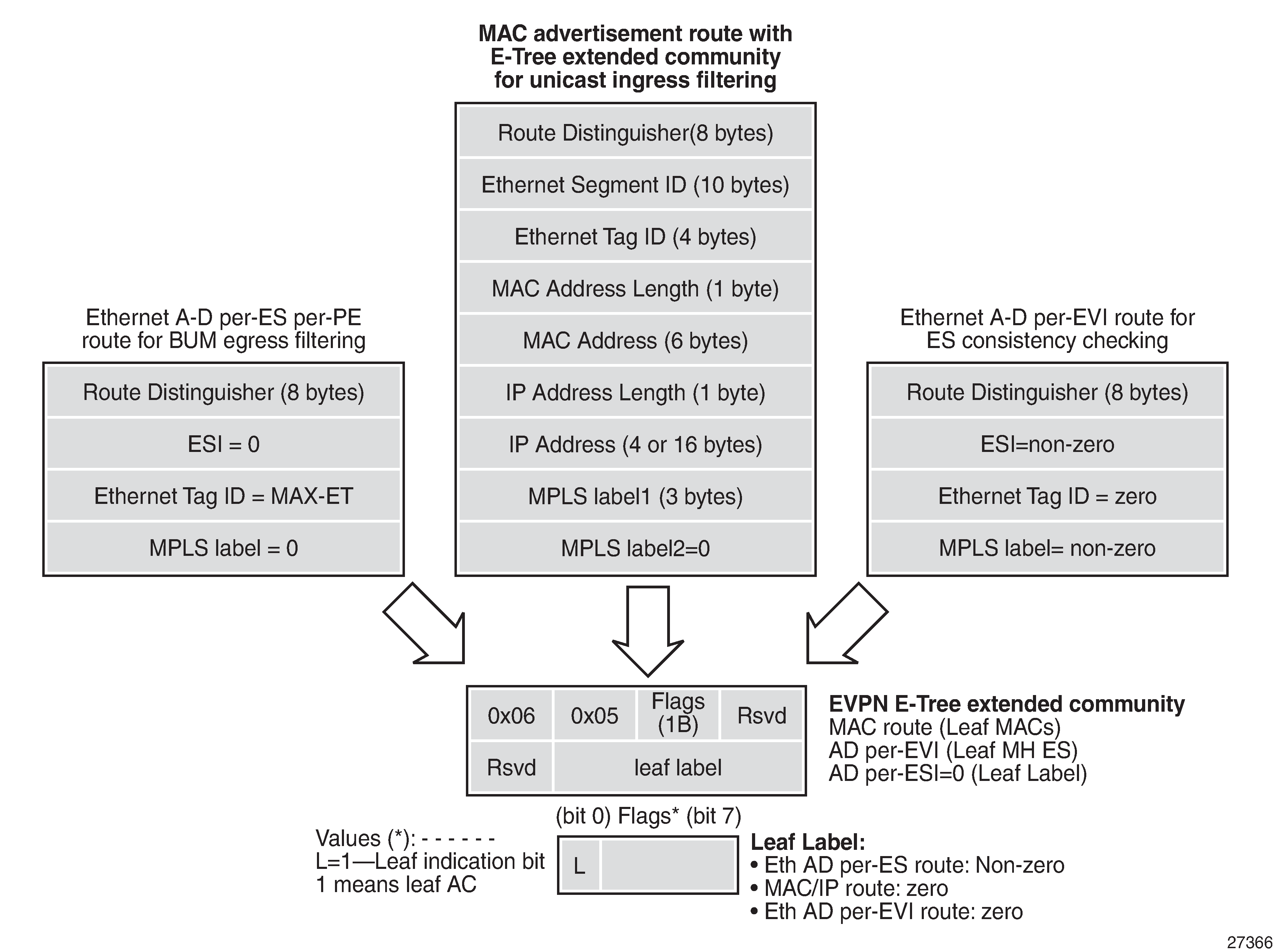 SAPs or SDP bindings are by default root AC objects. MAC addresses learned on root AC objects are advertised as usual, while MAC addresses learned on a SAP or SDP binding configured as leaf AC are advertised with an BGP EVPN E-Tree extended community with leaf indication bit L=1.