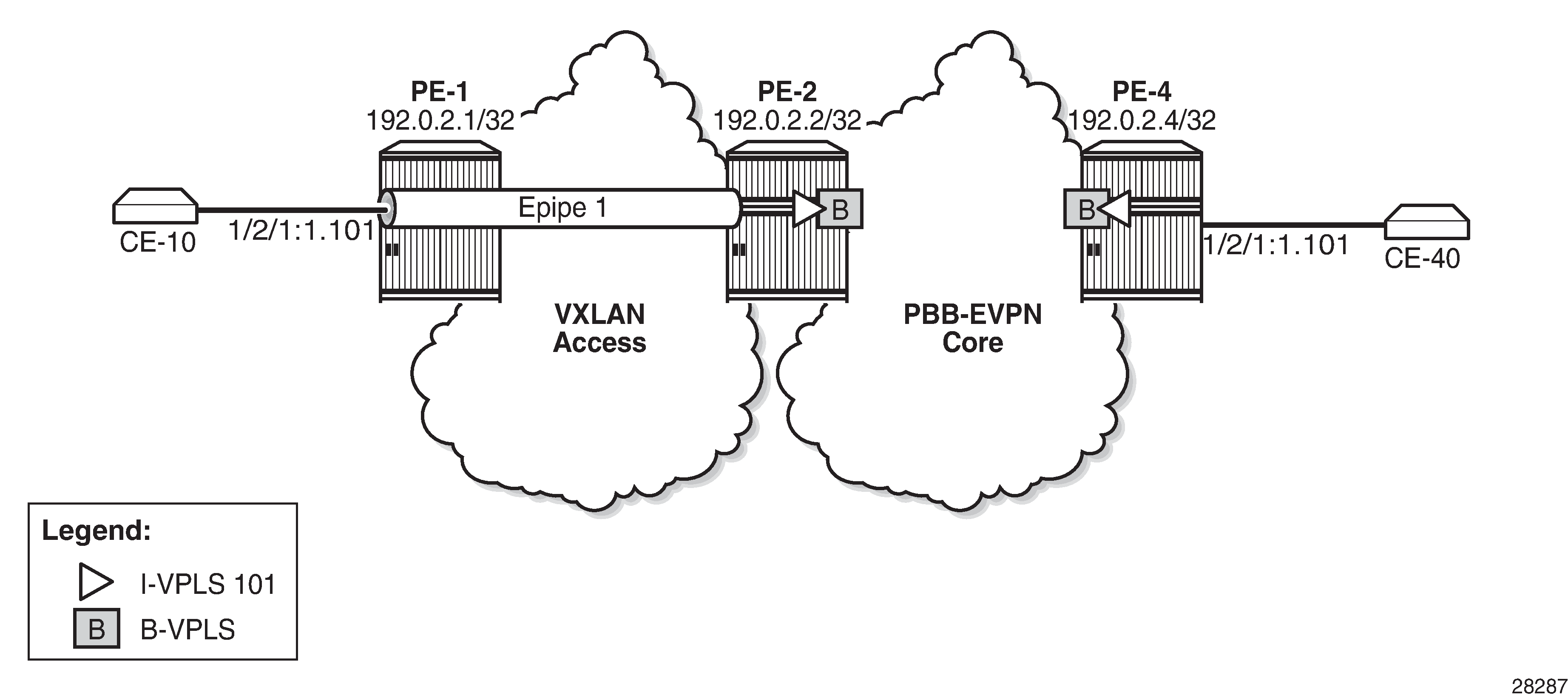 Static VXLAN termination on system IP addresses shows an example topology with three PEs and two CEs. Epipe 1 is configured on PE-1 and PE-2. PE-2 and PE-4 are part of a PBB-EVPN network. On PE-2, a port cross-connect (PXC) is configured to connect the SAP in Epipe 1 and the SAP in I-VPLS 101. CE-10 and CE-40 can send traffic to each other.