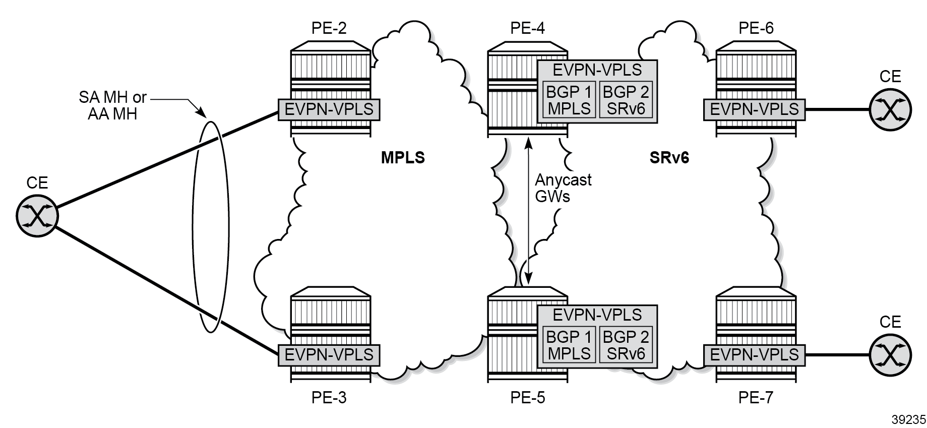 The need for MPLS to SRv6 stitching in an EVPN VPLS shows an EVPN VPLS service configured in all PEs where the gateways (GWs) PE-4 and PE-5 have two service instances in the EVPN VPLS: BGP instance 1 uses MPLS transport and BGP instance 2 uses SRv6. For GW redundancy on PE-4 and PE-5, the anycast multihoming concept is applied.