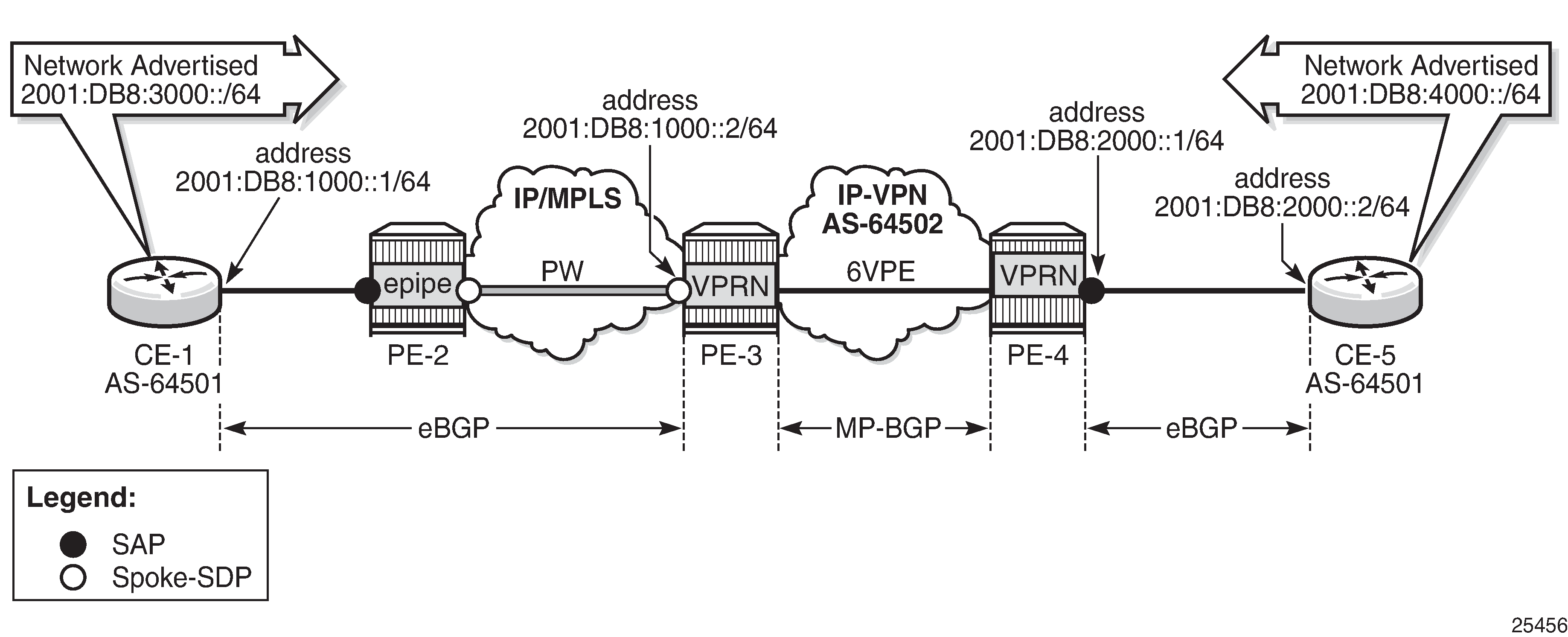 PE-3 has an MP-eBGP session with CE-1 to receive and advertise IPv6 routes. PE-3 also has an MP-iBGP peering session with PE-4 to use 6VPE to tunnel IPv6 routes and traffic to and from PE-4. PE-4 has an IPv6 SAP interface to CE-5 and uses MP-eBGP to advertise to and receive routes from CE-5 (no spoke termination). The configuration of PE-3 is included to provide examples of the end-to-end VPRN service using a 6VPE model.