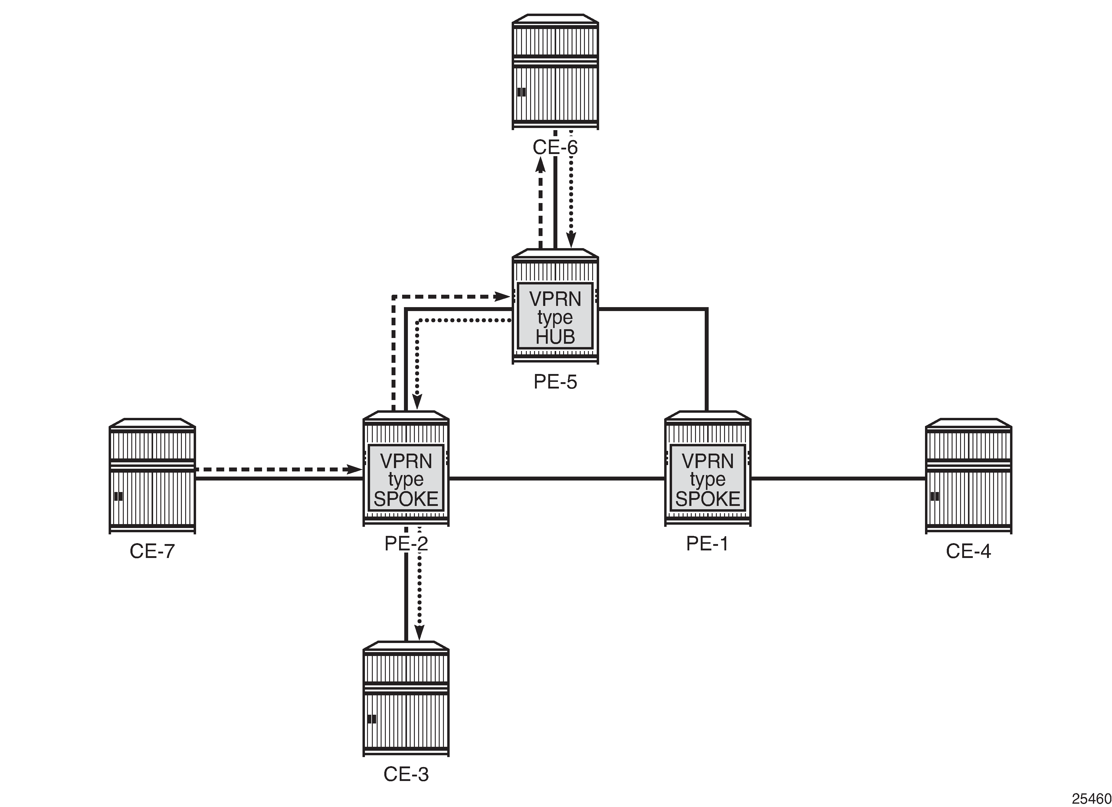 The only way for CE-7 to communicate with CE-3 is via hub site CE-6. The same applies to the communication between CE-7 and CE-4. The VPRN on PE-2 is configured as type spoke and has IP interfaces using SAPs or spoke SDPs that are considered spoke sites only. No direct communication between any of the spoke CE sites in the network is allowed.