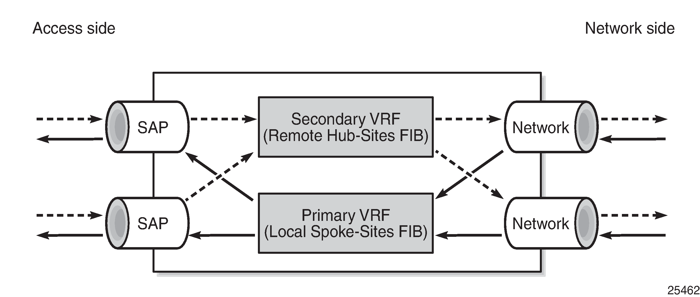 The secondary VRF is used for forwarding traffic from the IP interfaces using SAPs or spoke SDPs toward the network interfaces or other VPRN instances. This VRF is populated with routes learned via MP-BGP from hub sites.