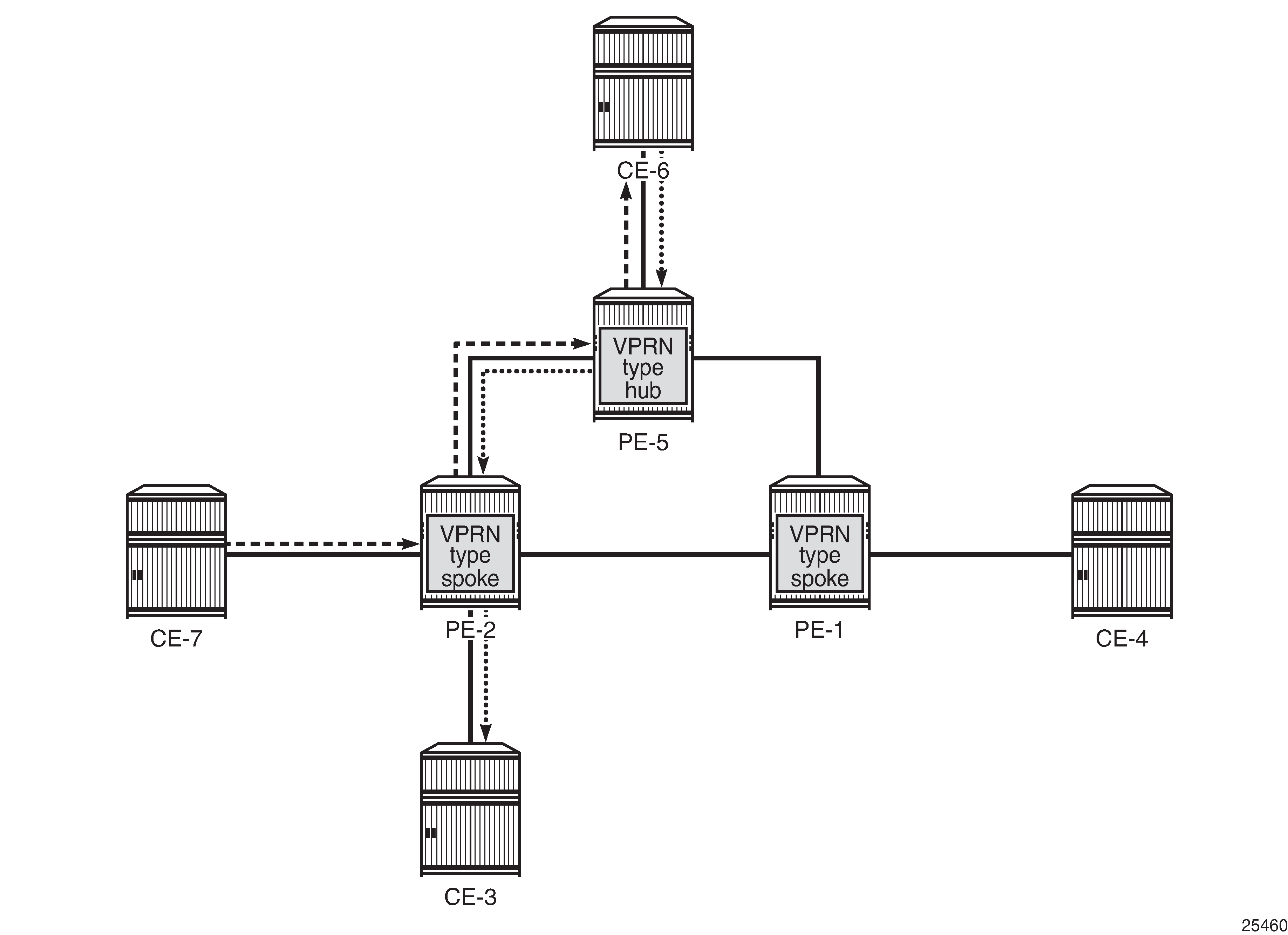The only way for CE-7 to communicate with CE-3 is via hub site CE-6. The same applies to the communication between CE-7 and CE-4. The VPRN on PE-2 is configured as vprn-type spoke and has IP interfaces using SAPs or spoke SDPs that are considered spoke sites only. No direct communication between any of the spoke CE sites in the network is allowed.