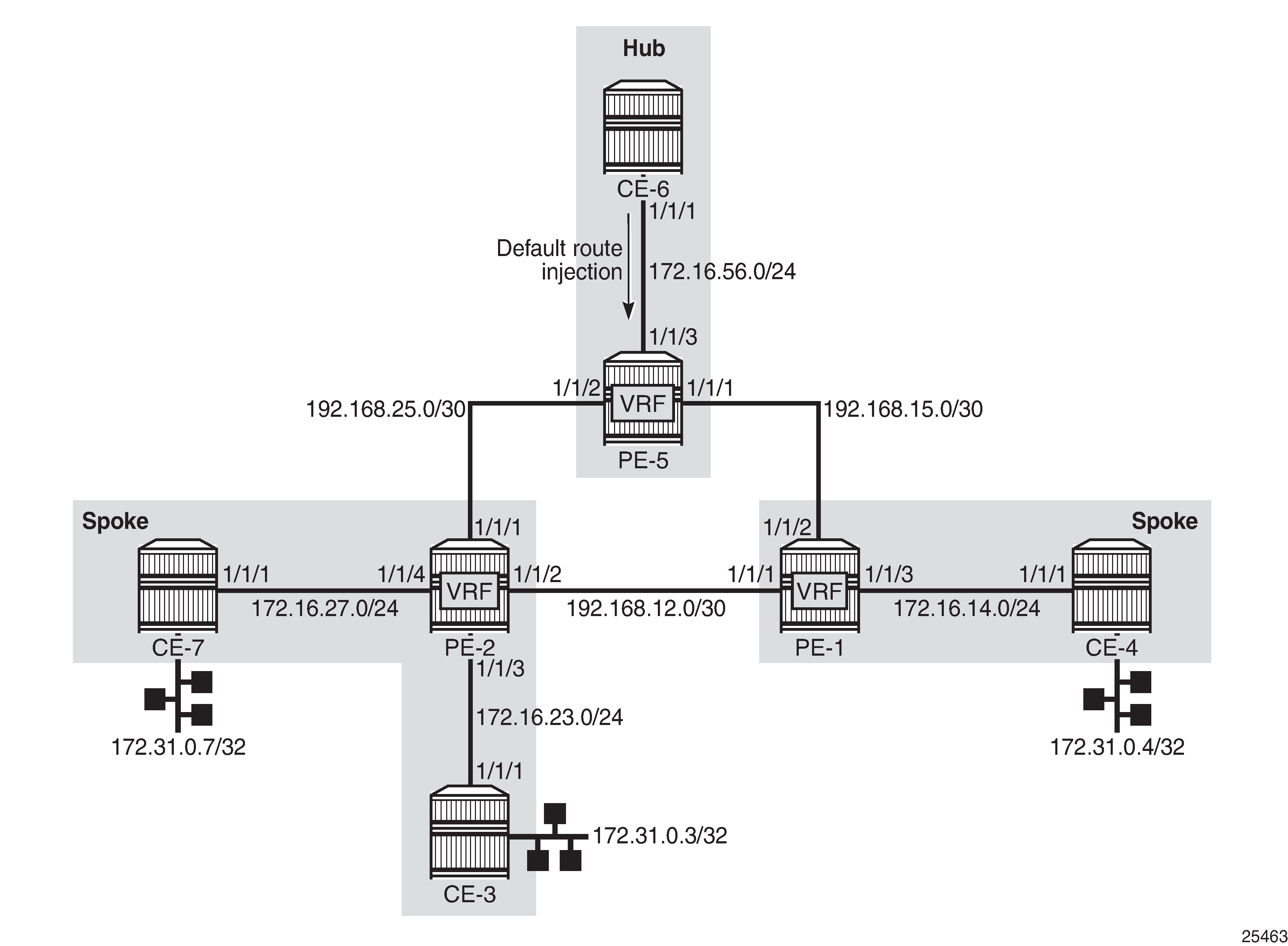This chapter provides a basic technology overview and configuration examples of a network topology used for a Layer 3 VPRN CE hub and spoke architecture.