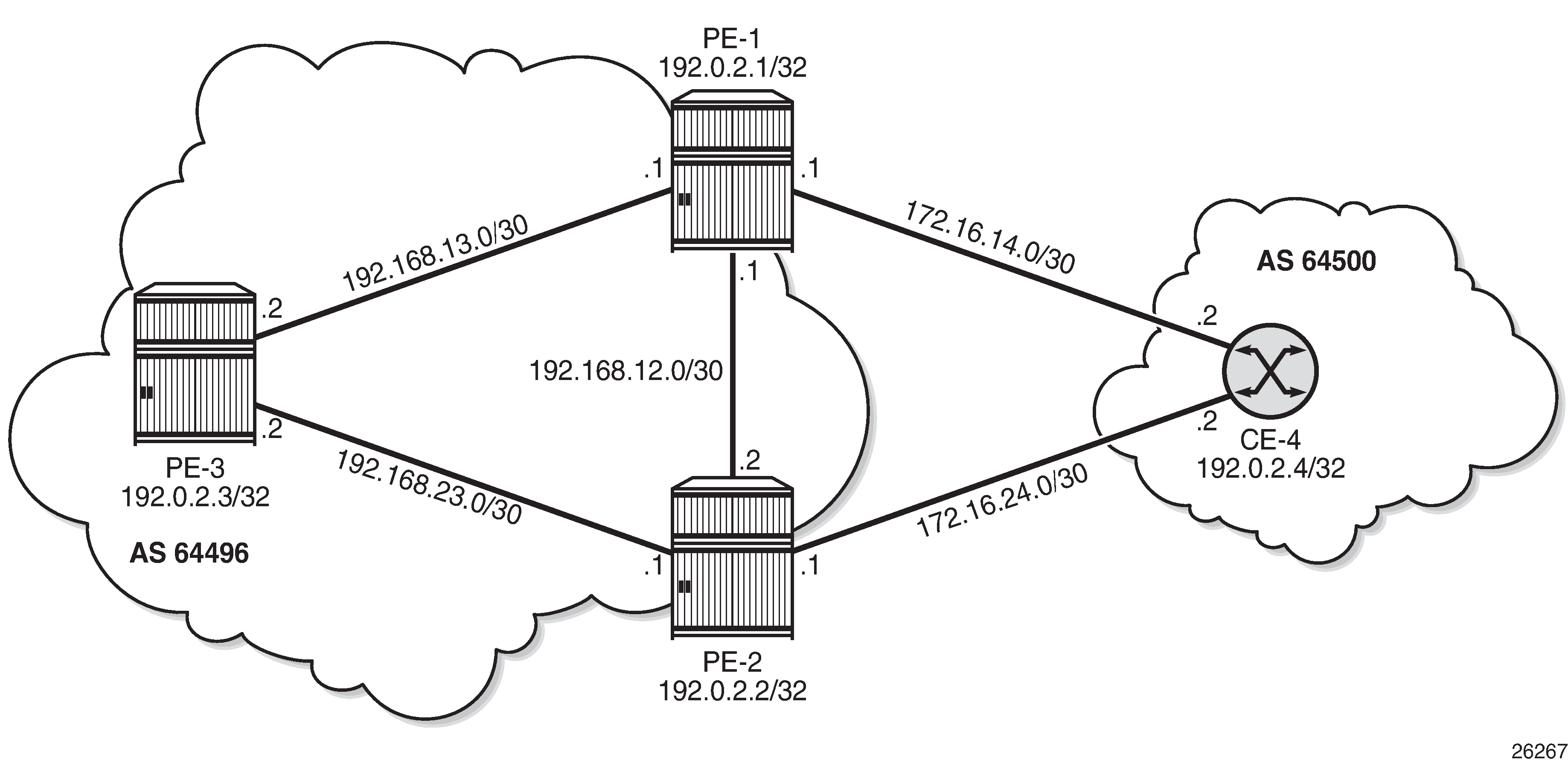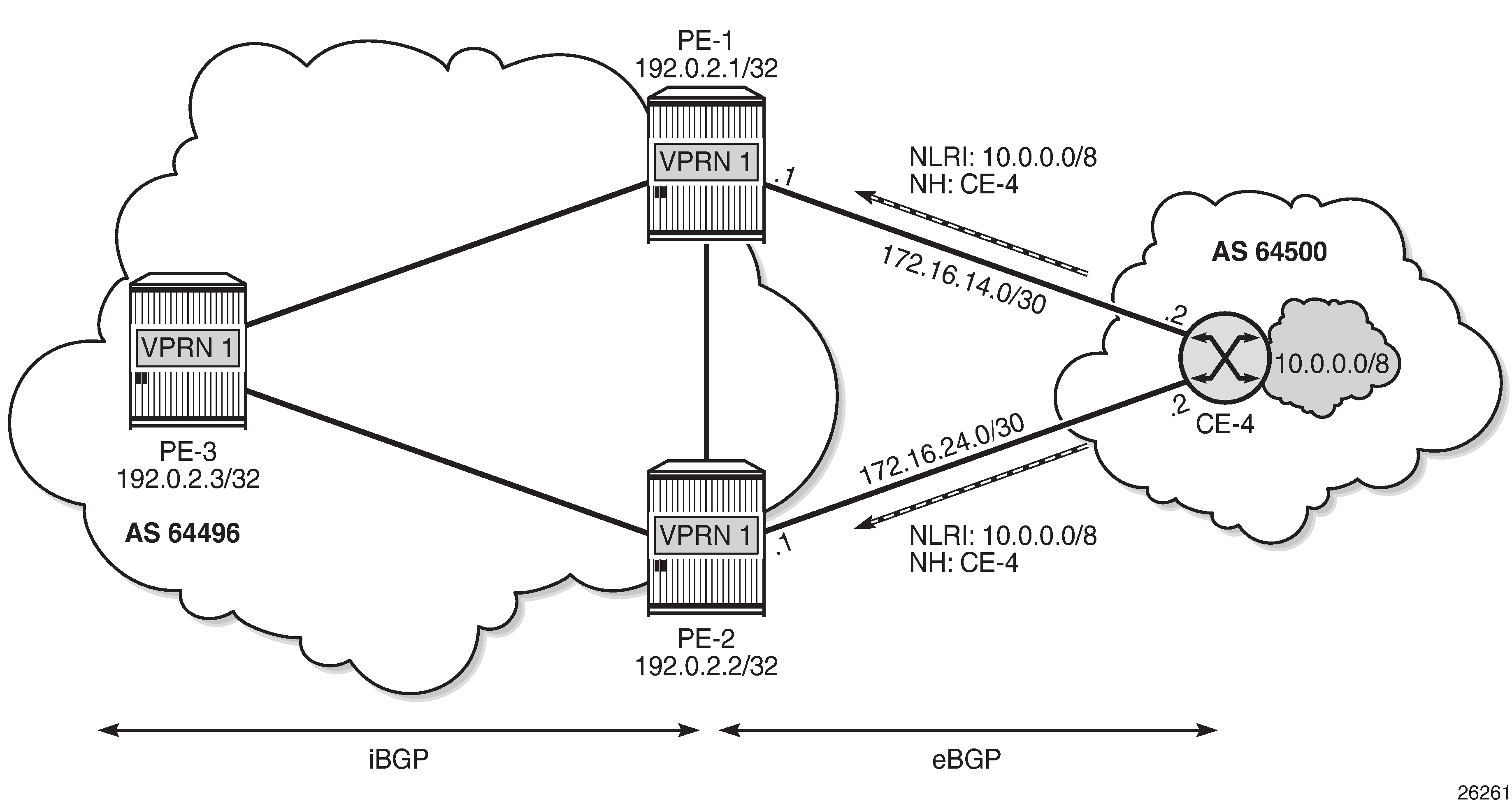 CE-4 advertises prefix 10.0.0.0/8 to its EBGP peers PE-1 and PE-2 shows the example topology with CE-4 in Autonomous System (AS) 64500 advertising prefix 10.0.0.0/8 to VPRN 1 in PE-1 and PE-2 in AS 64496.