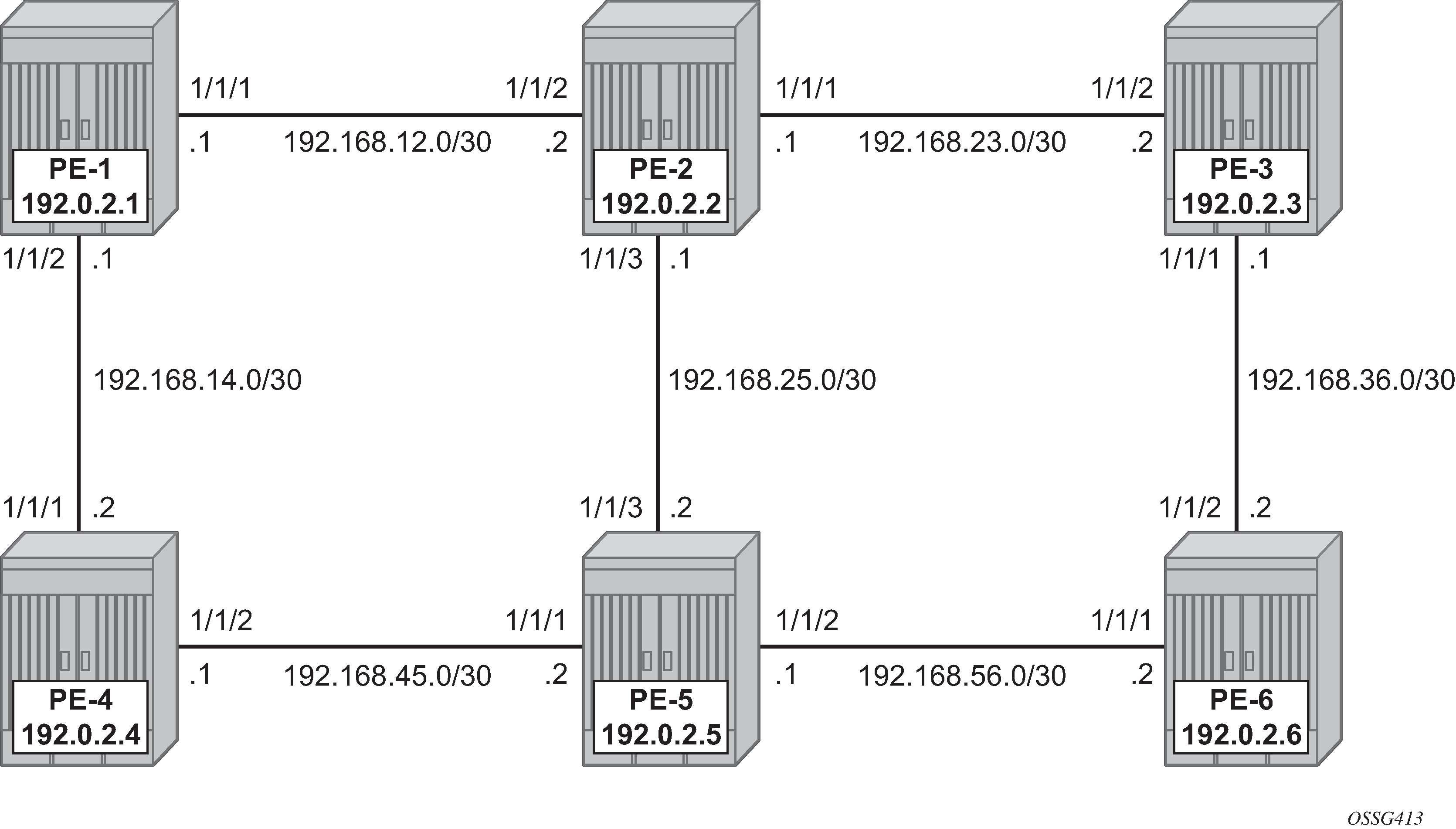 IS-IS, MPLS, and RSVP are configured on all interfaces. TE is enabled in IS-IS. Optionally, admin groups ‟green” and ‟red” are configured on all nodes. The ‟green” links are the following: the link between PE-1 and PE-2, the link between PE-2 and PE-3, and the link between PE-3 and PE-6. The ‟red” links are: the link between PE-1 and PE-4, the link between PE-4 and PE-5, and the link between PE-5 and PE-6. The remaining link is the link between PE-2 and PE-5, which does not belong to an admin group. For more information about admin groups, see chapter RSVP Point-to-Point LSPs.