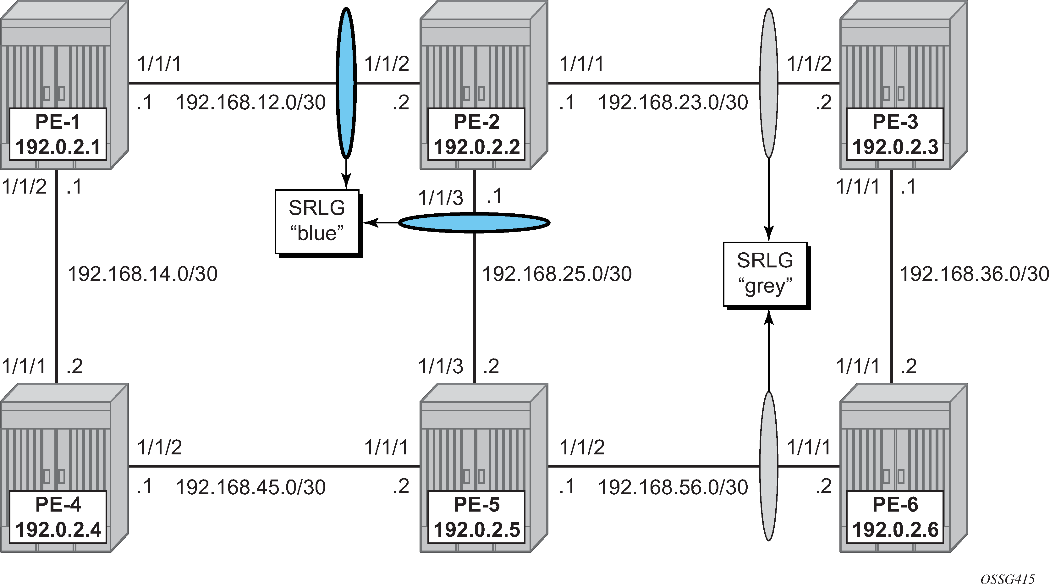 The configuration of the blue SRLG group is only mandatory on PE-1, PE-2, and PE-5, while the gray SRLG group is only mandatory on PE-2, PE-3, PE-5, and PE-6. However, it is good practice to configure both SRLG groups on all nodes, as follows: