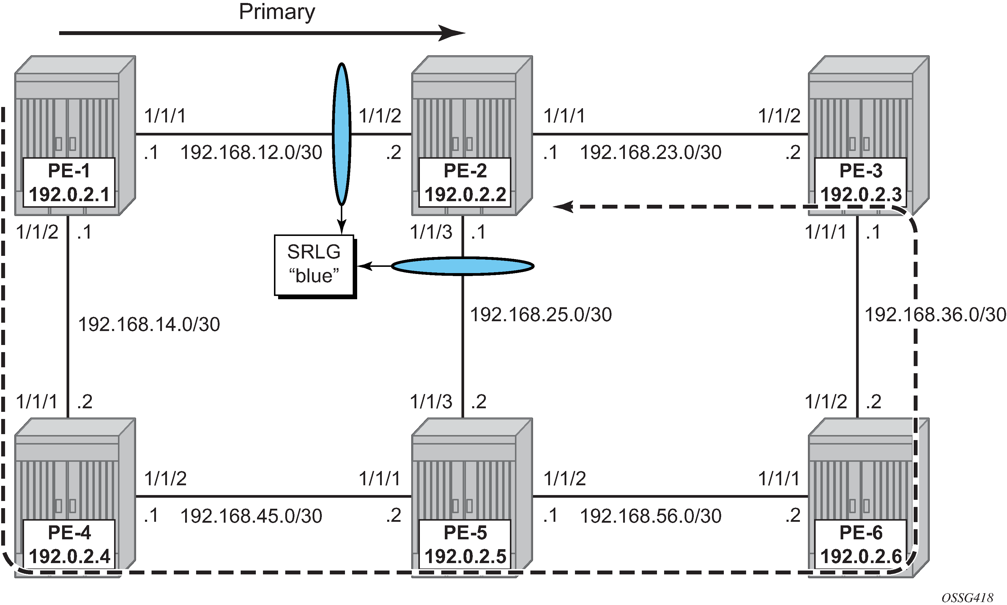 The IP/MPLS interfaces need to be linked to the related SRLG group, which is a uni-directional indicator, applying only to the egress direction; therefore, it needs to be configured on both sides of the IP/MPLS interface. For example, on PE-1, the interface to PE-2 is part of srlg-group ‟blue”. An interface can be part of multiple SRLG groups similar to the admin-group functionality.