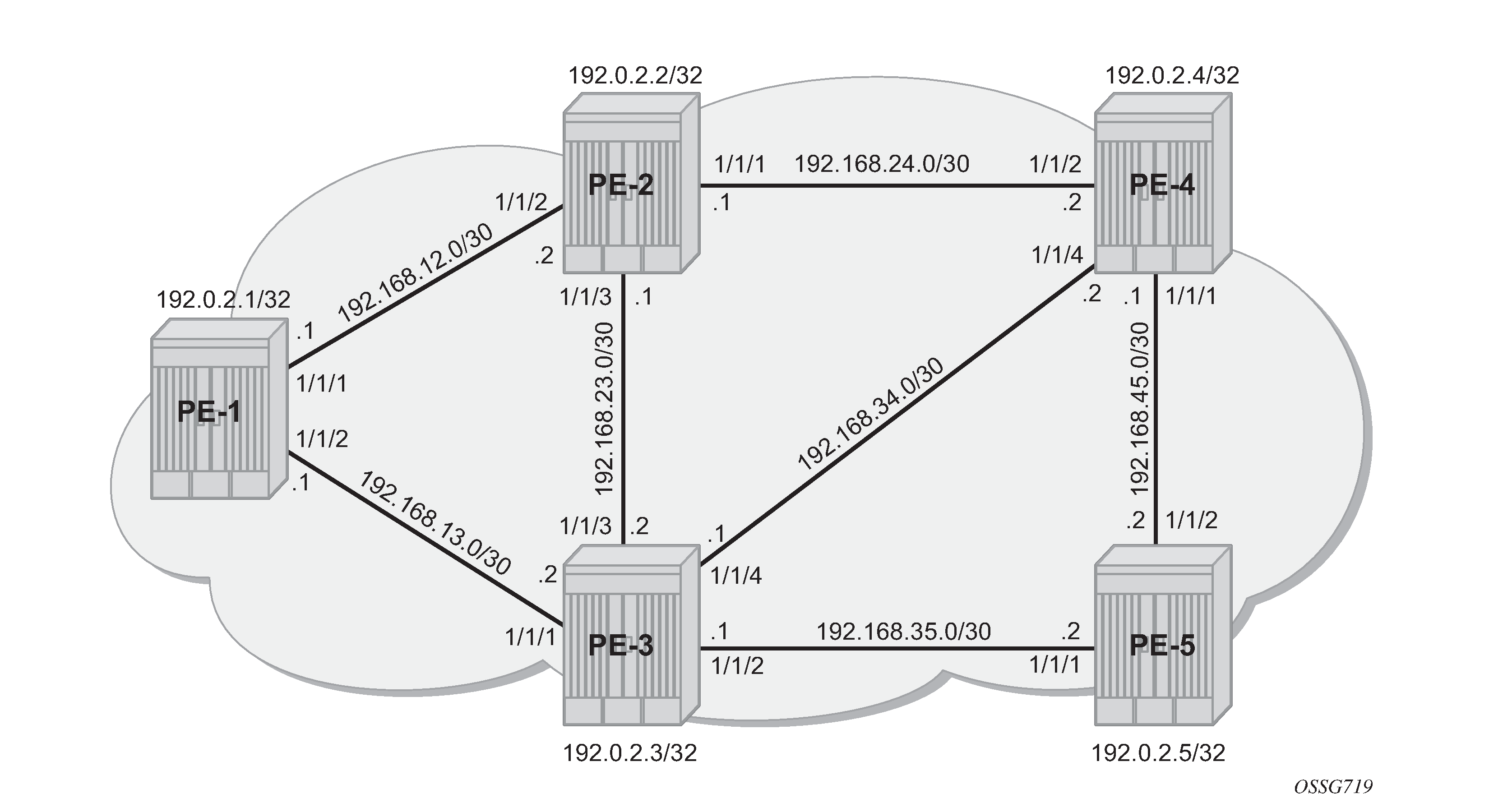 For a link LFA next-hop calculation of prefix 192.0.2.5/32 (D) on PE-1, this means that the shortest path from backup next-hop router PE-2 toward destination PE-5 must be smaller than the sum of the shortest path from backup next-hop router PE-2 toward source PE-1 with the shortest path from source PE-1 to destination PE-5.