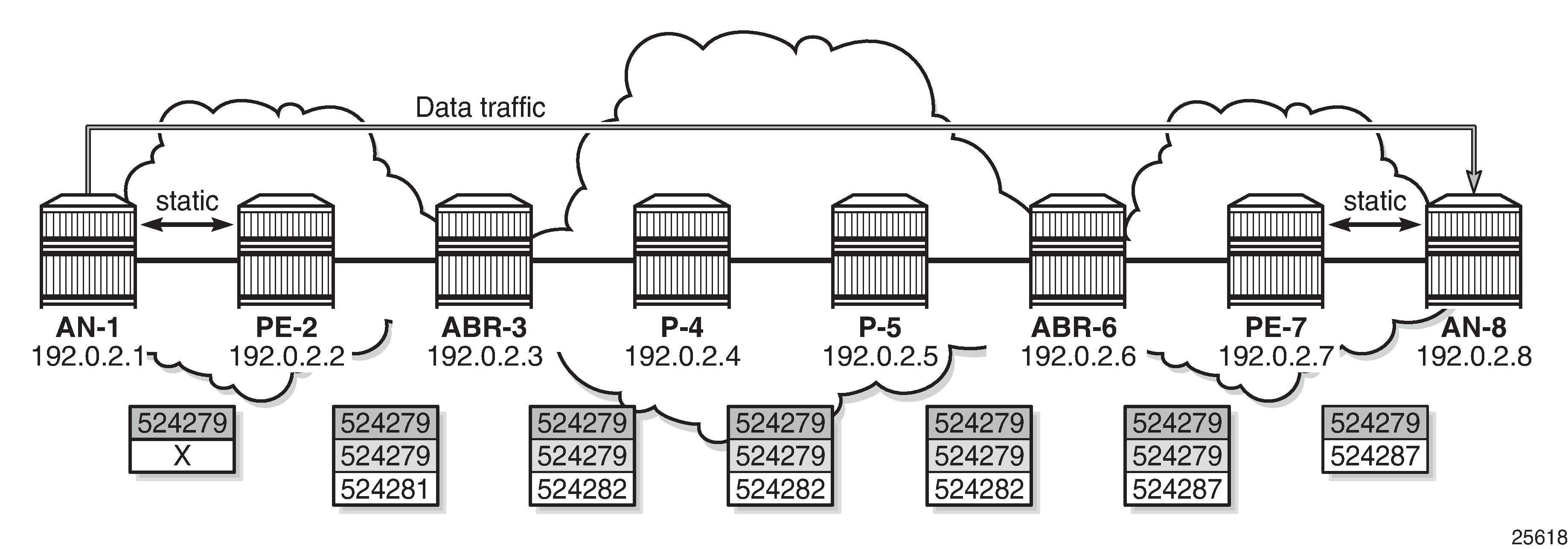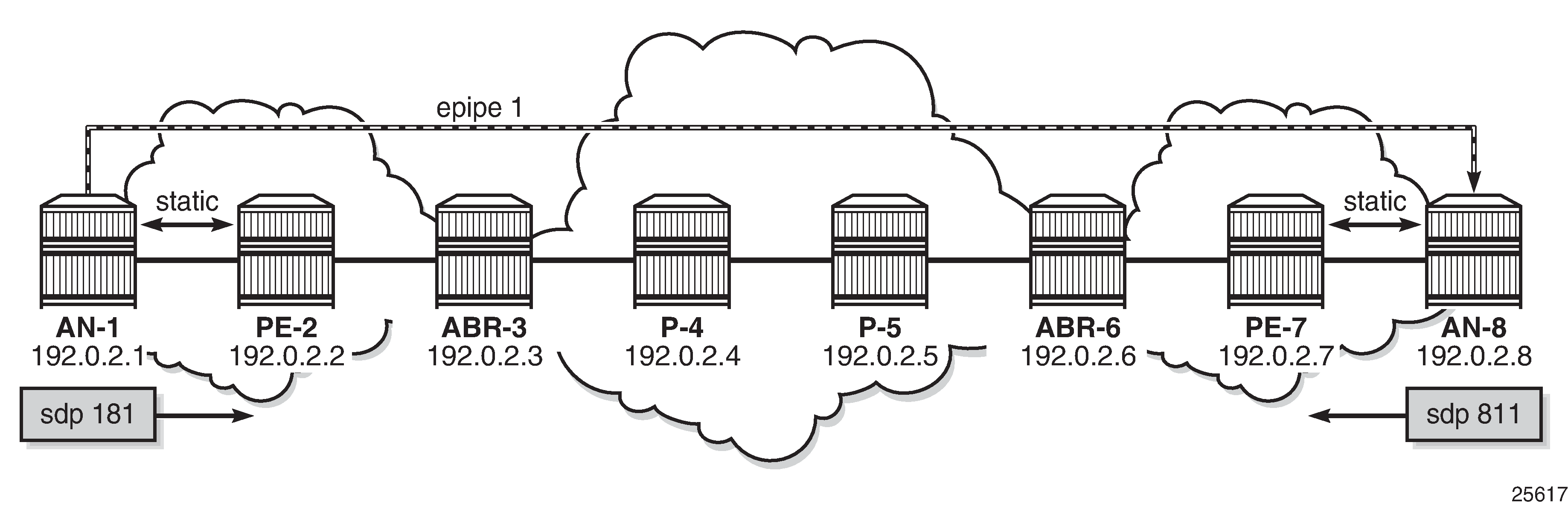 # on PE-2: configure router interface "int-PE-2-AN-1" address 192.168.12.2/30 port 1/1/2 exit interface "int-PE-2-ABR-3" address 192.168.23.1/30 port 1/1/1 exit interface "system" address 192.0.2.2/32 exitStatic routes are configured between AN-1 and PE-2 and between PE-7 and AN-8: