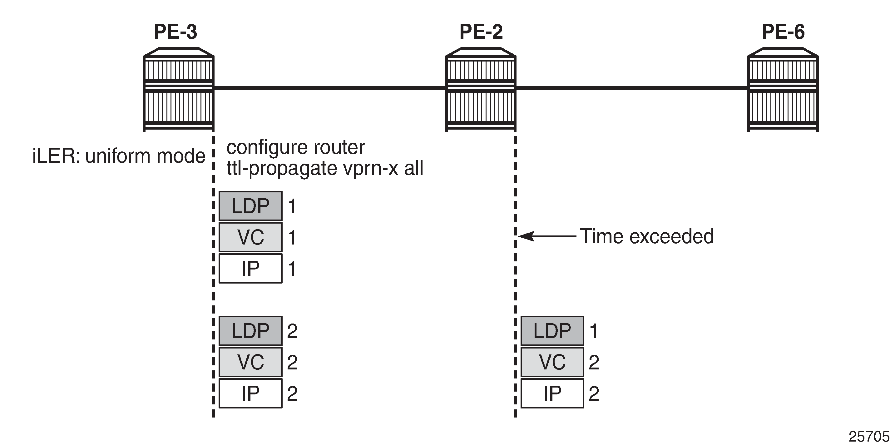 For packets received in the context of VPRN, the TTL of the forwarded IP packet is set to MIN{MPLS_TTL-1, VC_TTL-1, IP_TTL-1}, where MPLS_TTL refers to the TTL in the outermost label in the popped stack and VC_TTL refers to the TTL in the VC label in the popped stack.