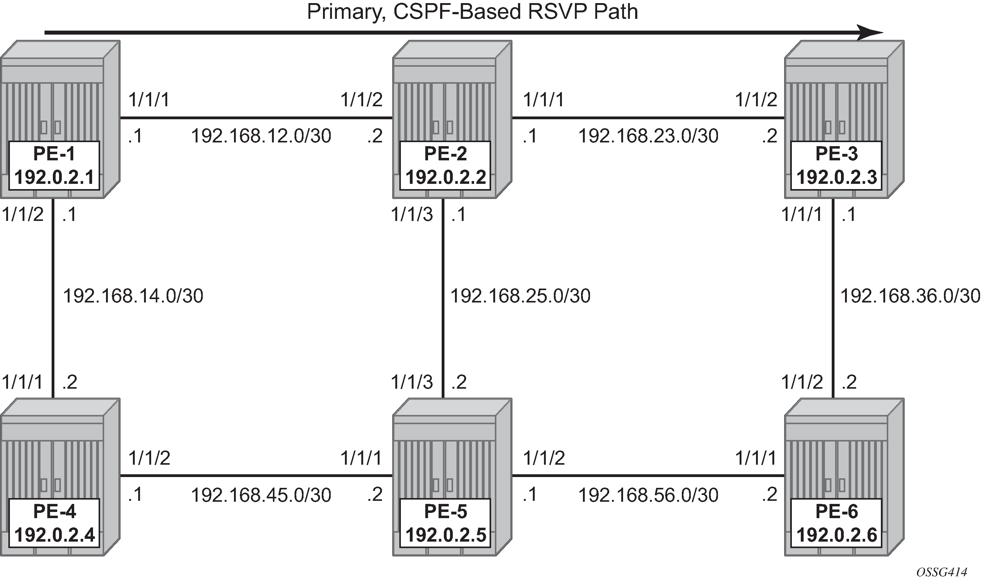 IS-IS, MPLS, and RSVP are configured on all interfaces. TE is enabled in IS-IS. Optionally, admin groups ‟green” and ‟red” are configured on all nodes. The ‟green” links are the following: the link between PE-1 and PE-2, the link between PE-2 and PE-3, and the link between PE-3 and PE-6. The ‟red” links are: the link between PE-1 and PE-4, the link between PE-4 and PE-5, and the link between PE-5 and PE-6. The remaining link is the link between PE-2 and PE-5, which does not belong to an admin group. For more information about admin groups, see chapter RSVP Point-to-Point LSPs.