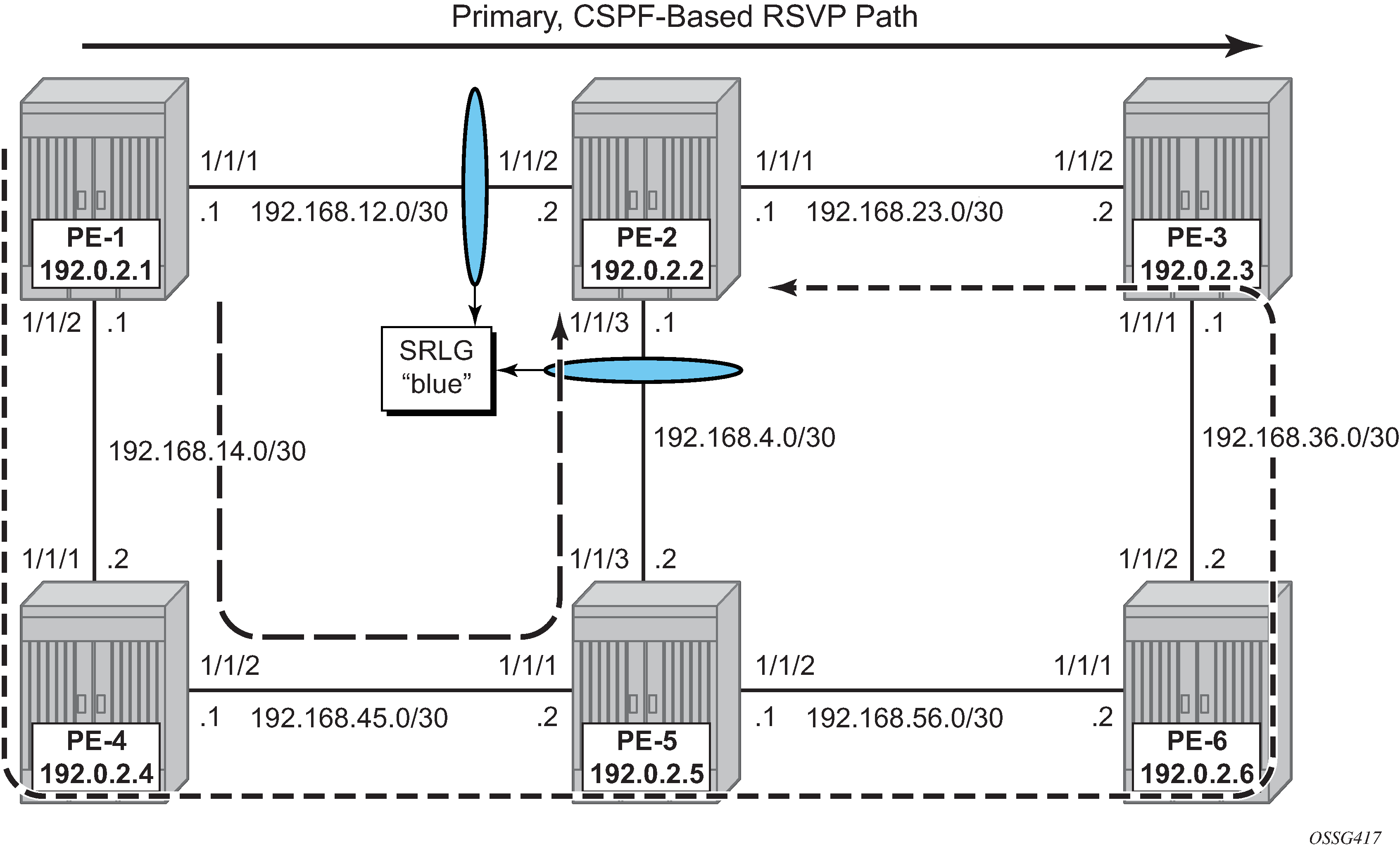 The IP/MPLS interfaces need to be linked to the related SRLG group, which is a unidirectional indicator, applying only to the egress direction; therefore, it needs to be configured on both sides of the IP/MPLS interface. For example on PE-1, the interface to PE-2 is part of srlg-group ‟blue”. An interface can be part of multiple SRLG groups similar to the admin-group functionality.
