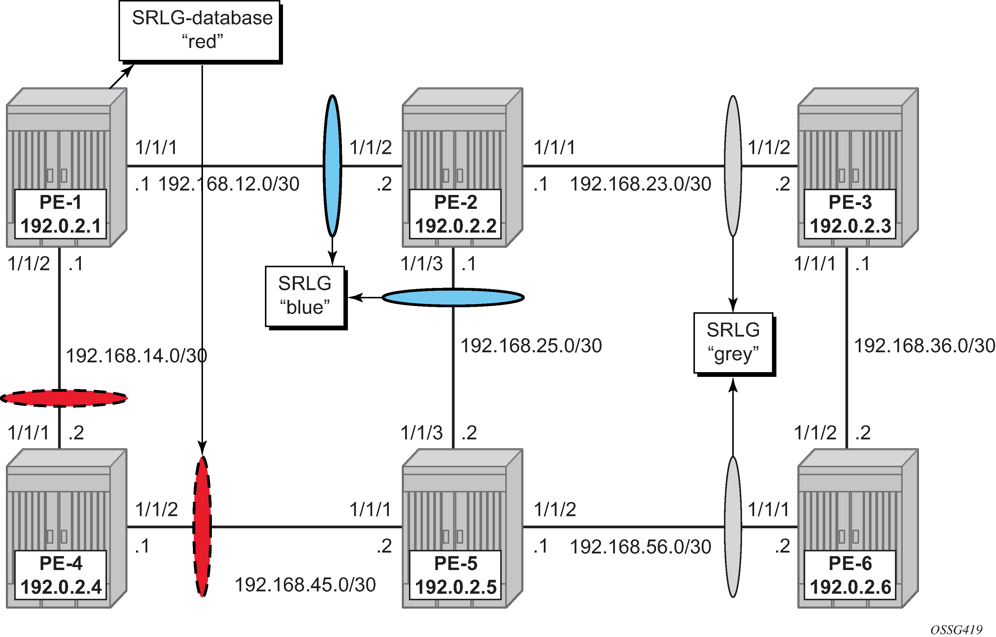 SRLG database example shows an example where an additional SRLG group ‟red” is defined on PE-1, with information related to the interface between PE-4 and PE-5.