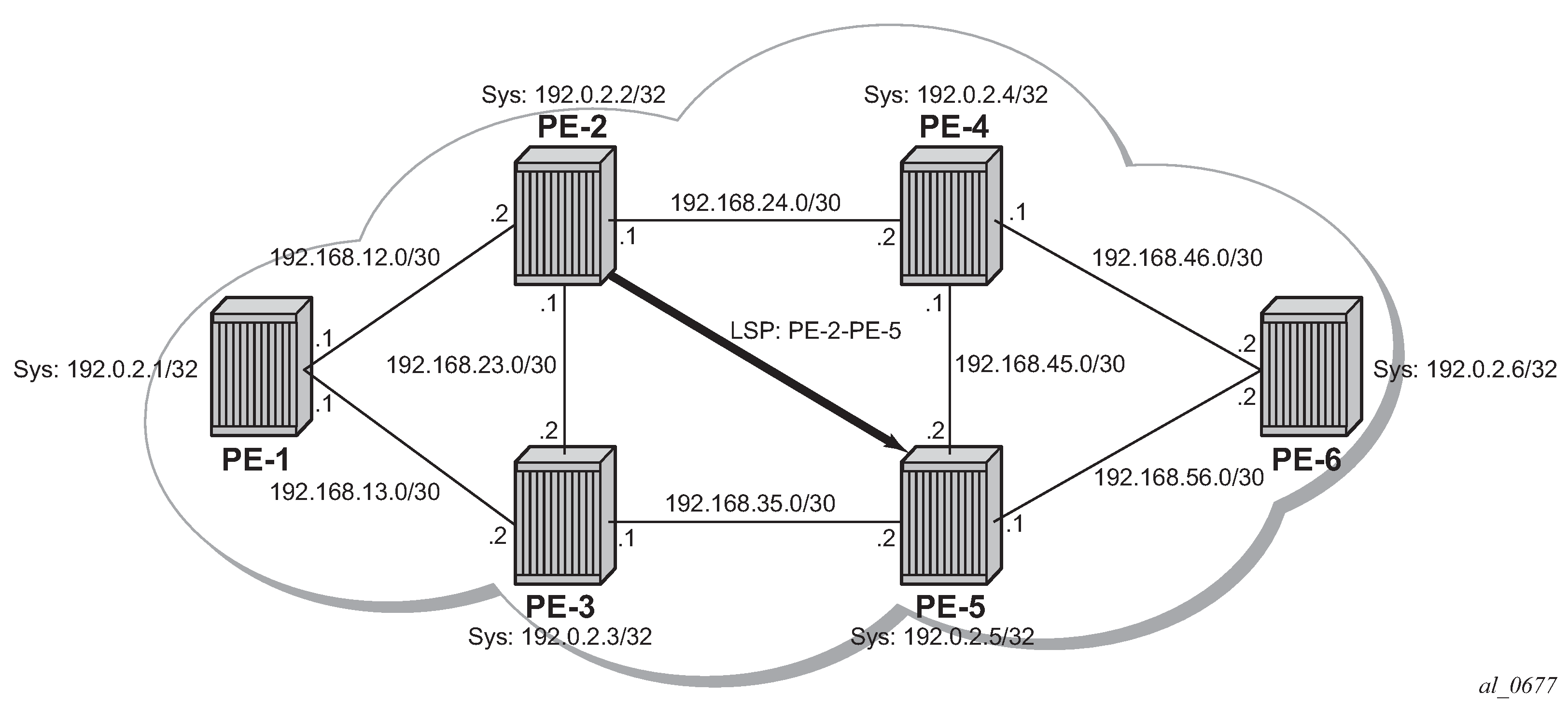 The example topology used in this example is shown in Example Topology. The setup consists of six 7750 service routers. There is a single AS and a single IGP area. The following configuration tasks should be completed first: