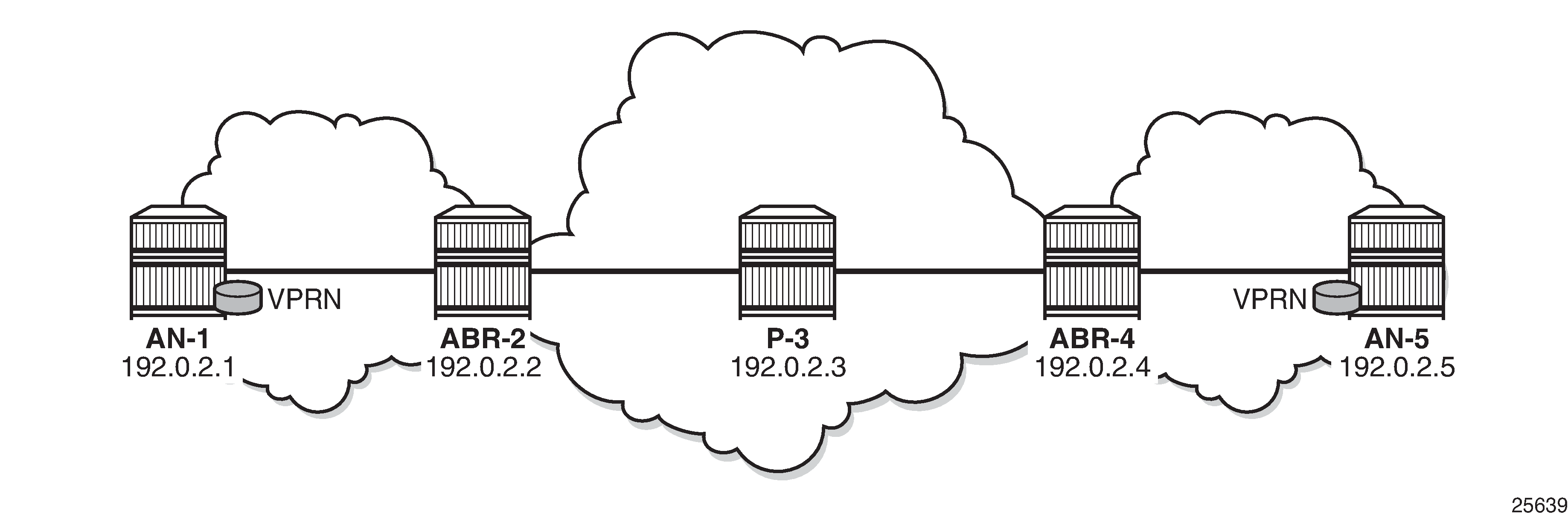 # on ABR-2: configure exclusive router "Base" { interface "int-ABR-2-AN-1" { port 1/1/c1/2 ipv4 { primary { address 192.168.12.2 prefix-length 30 } } } interface "int-ABR-2-P-3" { port 1/1/c1/1 ipv4 { primary { address 192.168.23.1 prefix-length 30 } } } interface "system" { ipv4 { primary { address 192.0.2.2 prefix-length 32 } } }