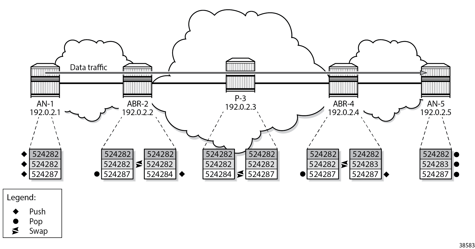 [/] A:admin@AN-1# show router bgp routes 192.0.2.5 label-ipv4 =============================================================================== BGP Router ID:192.0.2.1 AS:64496 Local AS:64496 =============================================================================== Legend - Status codes : u - used, s - suppressed, h - history, d - decayed, * - valid l - leaked, x - stale, > - best, b - backup, p - purge Origin codes : i - IGP, e - EGP, ? - incomplete =============================================================================== BGP LABEL-IPV4 Routes =============================================================================== Flag Network LocalPref MED Nexthop (Router) Path-Id IGP Cost As-Path Label ------------------------------------------------------------------------------- u*>i 192.0.2.5/32 100 None 192.0.2.2 None 10 No As-Path 524282 ------------------------------------------------------------------------------- Routes : 1 ===============================================================================The next hop is ABR-2. AN-1 pushes the LDP label 524287 to reach ABR-2, as follows: