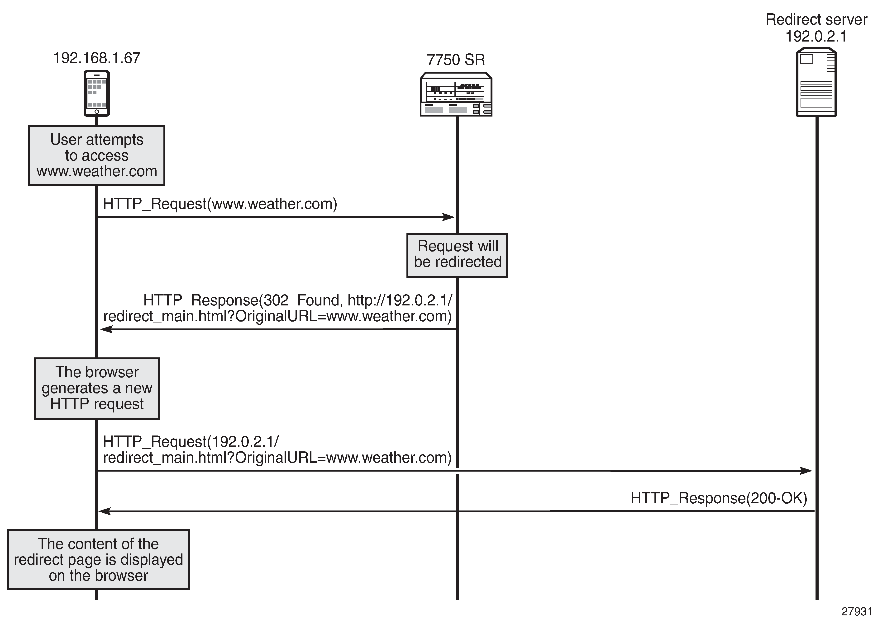 URL filter triggered HTTP redirect or HTTPS captive redirect (SR OS Release 16.0): redirects all HTTP/HTTPS traffic, based on a URL filter policy decision, where on block decision, the request can be redirected to a message portal