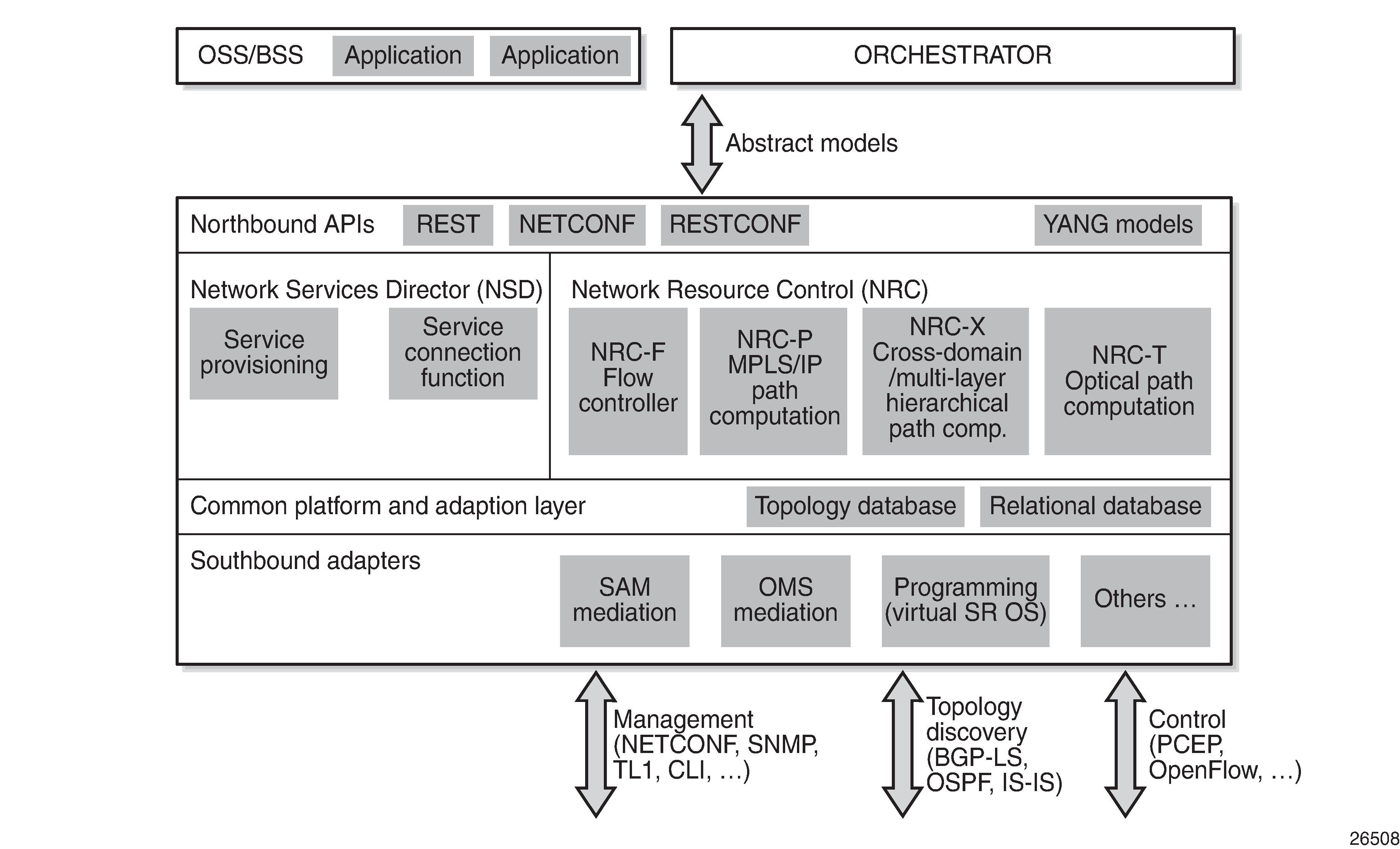 The external controller that computes a path is the Path Computation Element (PCE). In this case, it is the Network Resources Controller - Path (NRC-P), which runs within the Network Services Platform (NSP). The networking interface to the NRC-P is the Virtual Service Router - Network Resources Controller (VSR-NRC). The VSR-NRC is a virtual SR (vSR) OS instance that can run on a Linux server. The instance has a physical interface into the network, and collects topology information along with signaled path computation requests from head end routers.