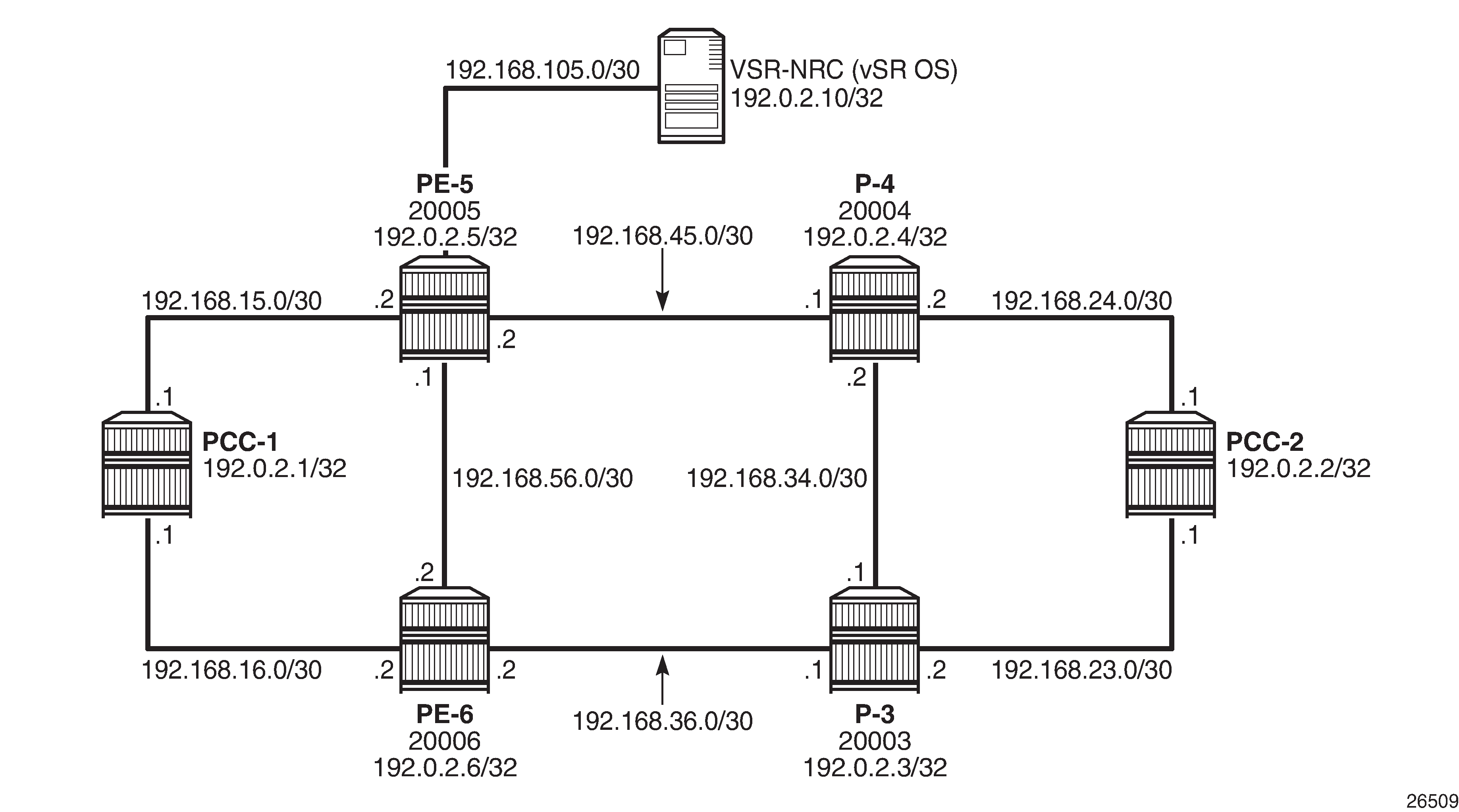 The creation of the vSR OS instance is outside the scope of this chapter. Also, there are several ways that the NRC-P can learn the network topology. For this chapter, it is just assumed that the NRC-P communication is configured, and that the complete topology database has been learned.