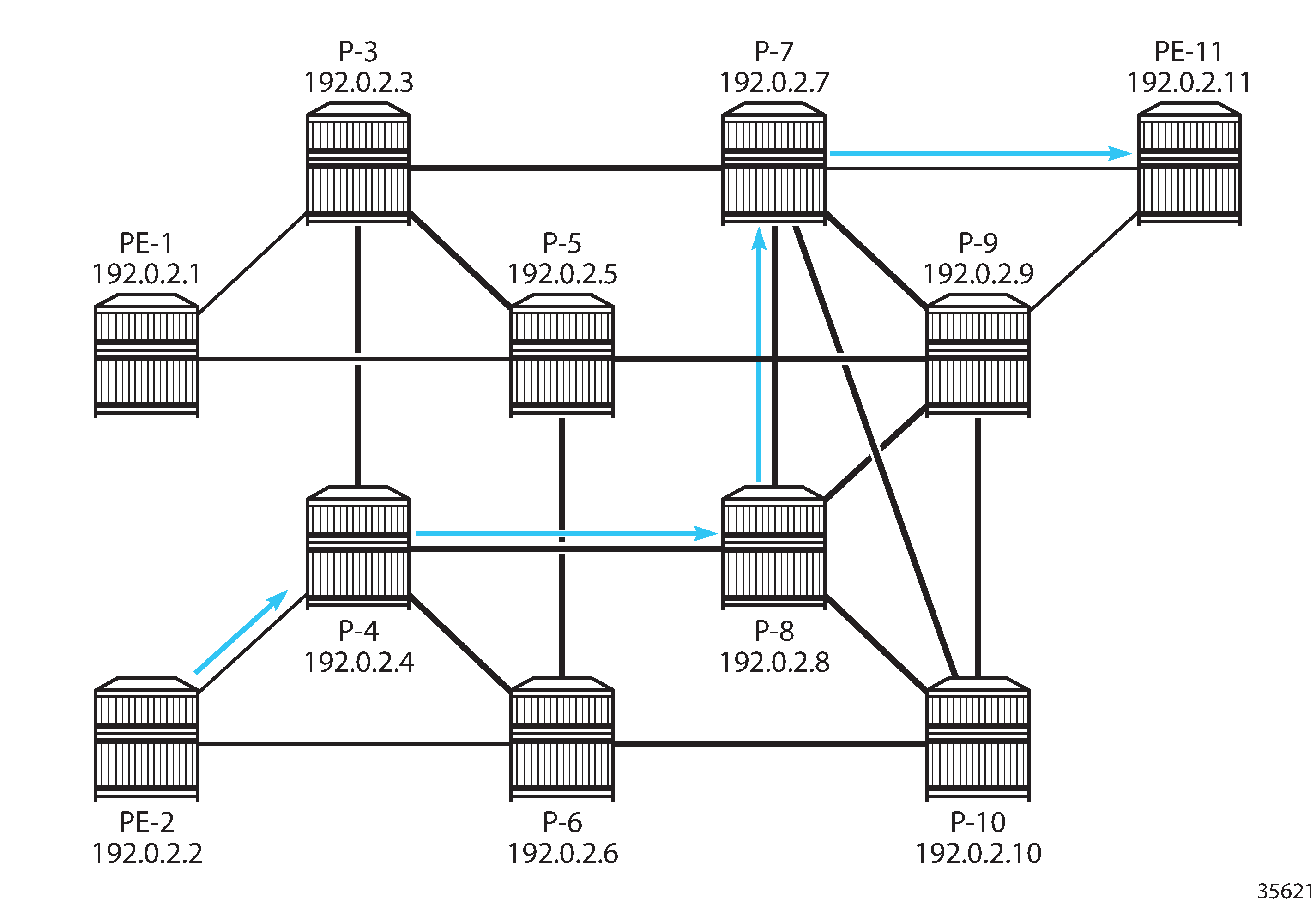 On PE-2, the following SR-TE LSPs with local CSPF path computation using a loose path are configured toward PE-11: