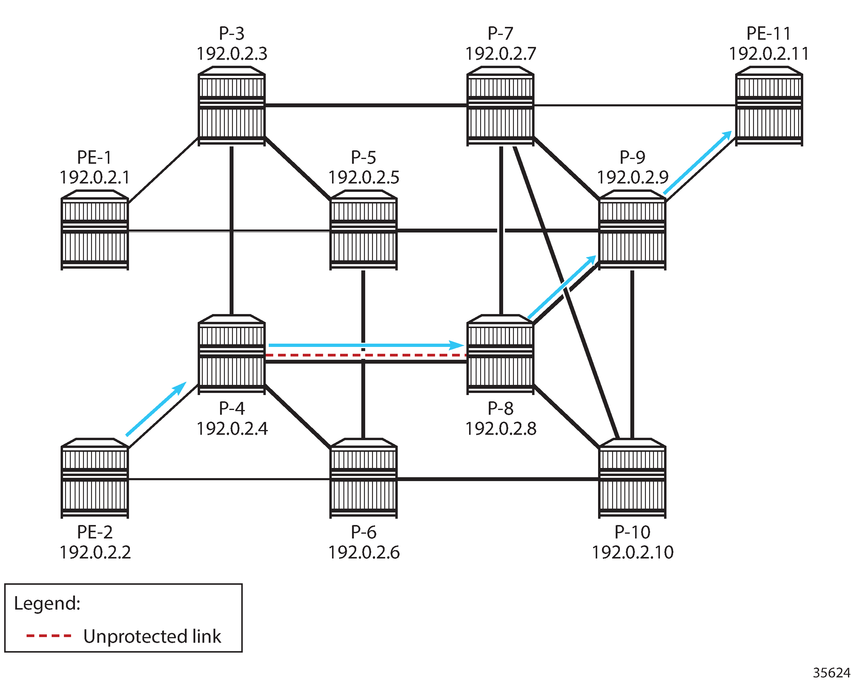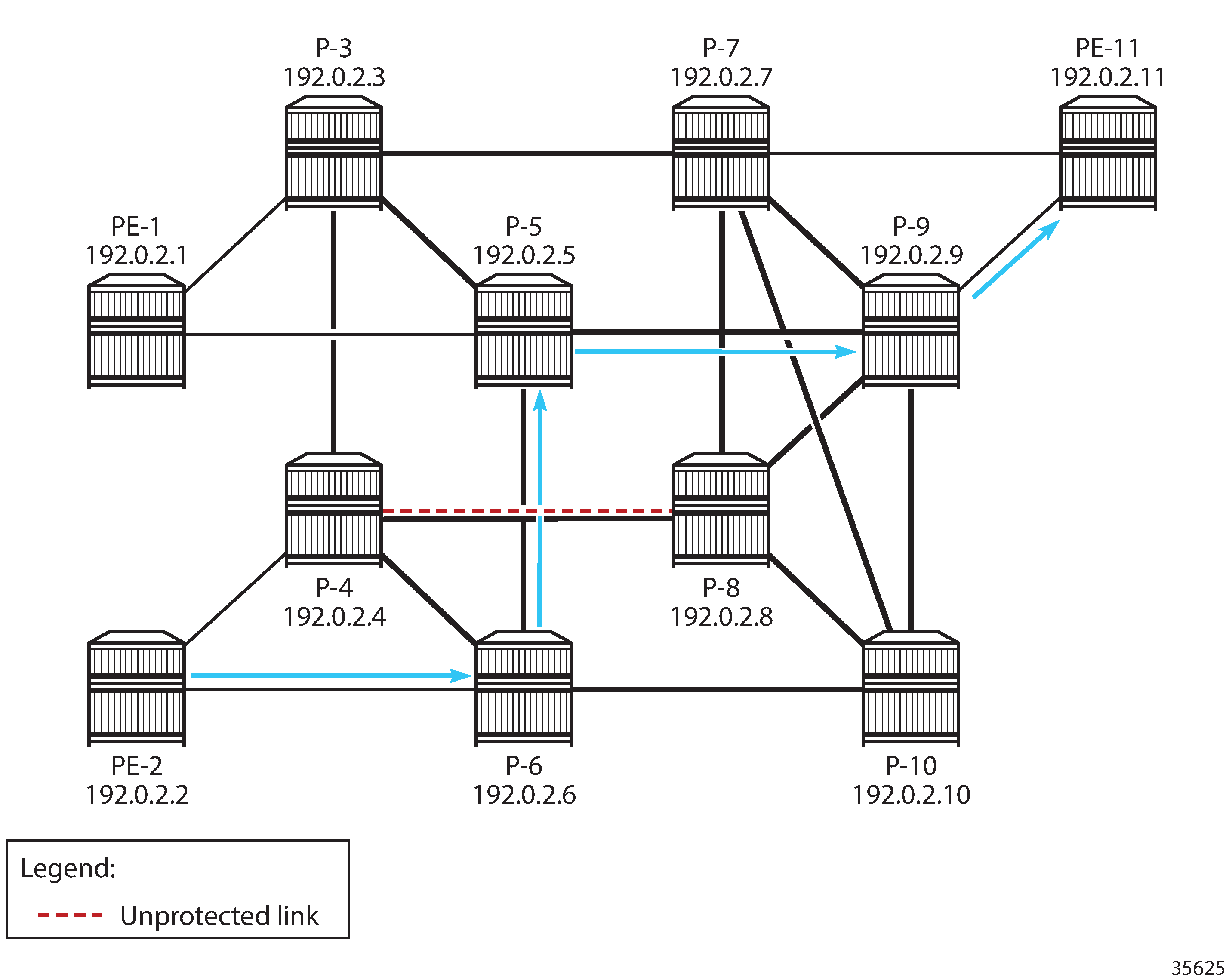 Loose path from PE-2 to PE-11 including unprotected link shows the established path from PE-2 to PE-11, which uses protected and unprotected links.