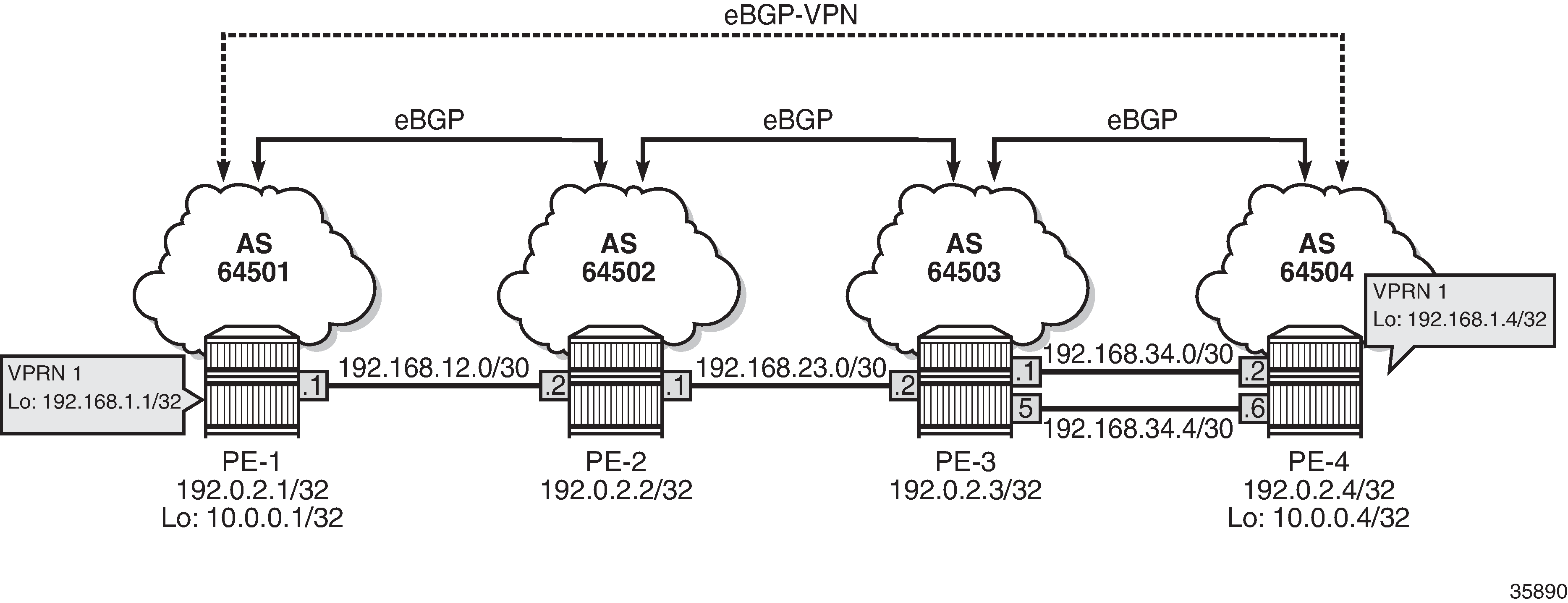 Example topology shows the example topology with four nodes in different ASs. The loopback addresses 10.0.0.1/32 on PE-1 and 10.0.0.4/32 on PE-4 are exported in BGP-LU IPv4 routes with prefix SID attribute.