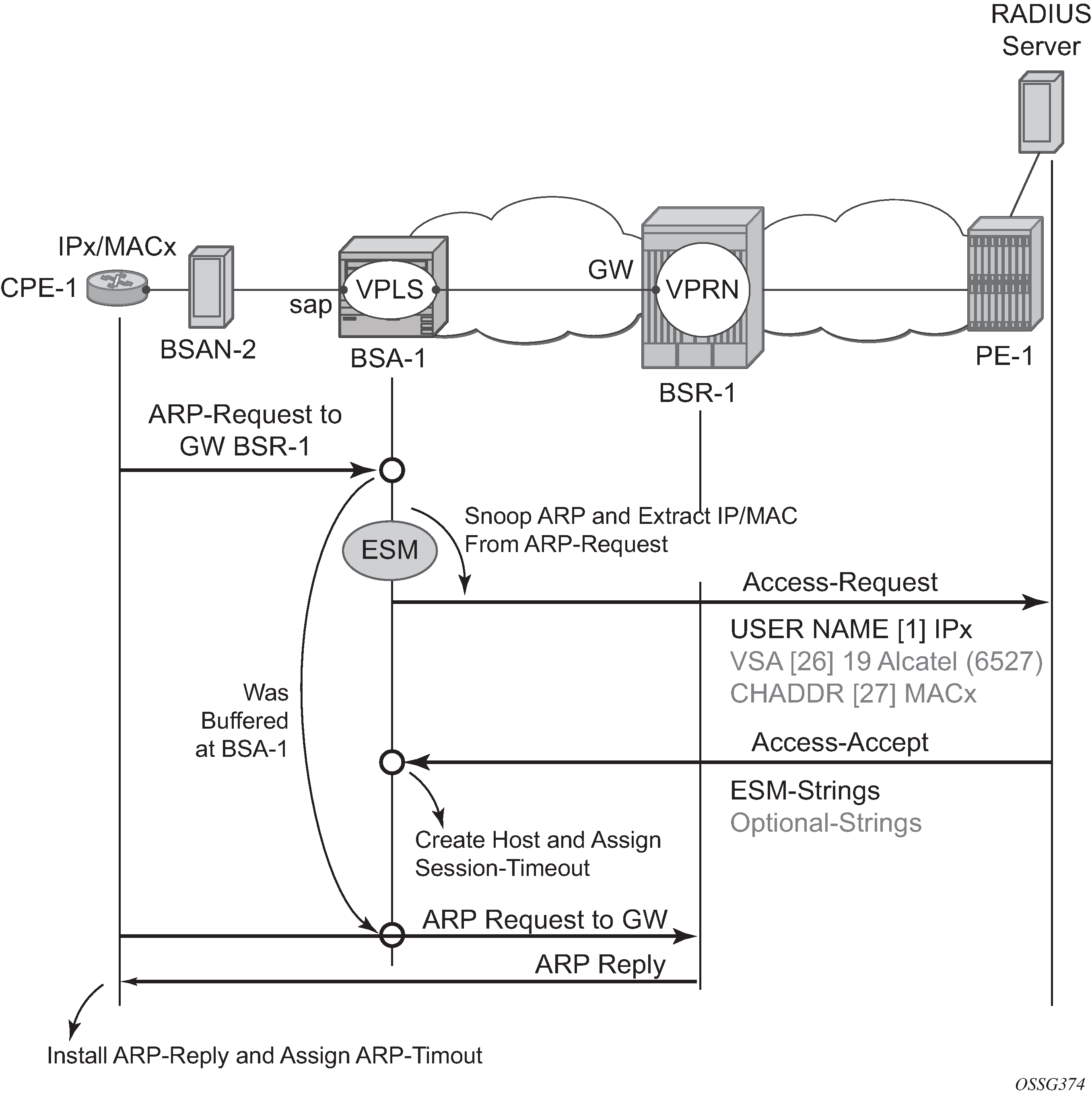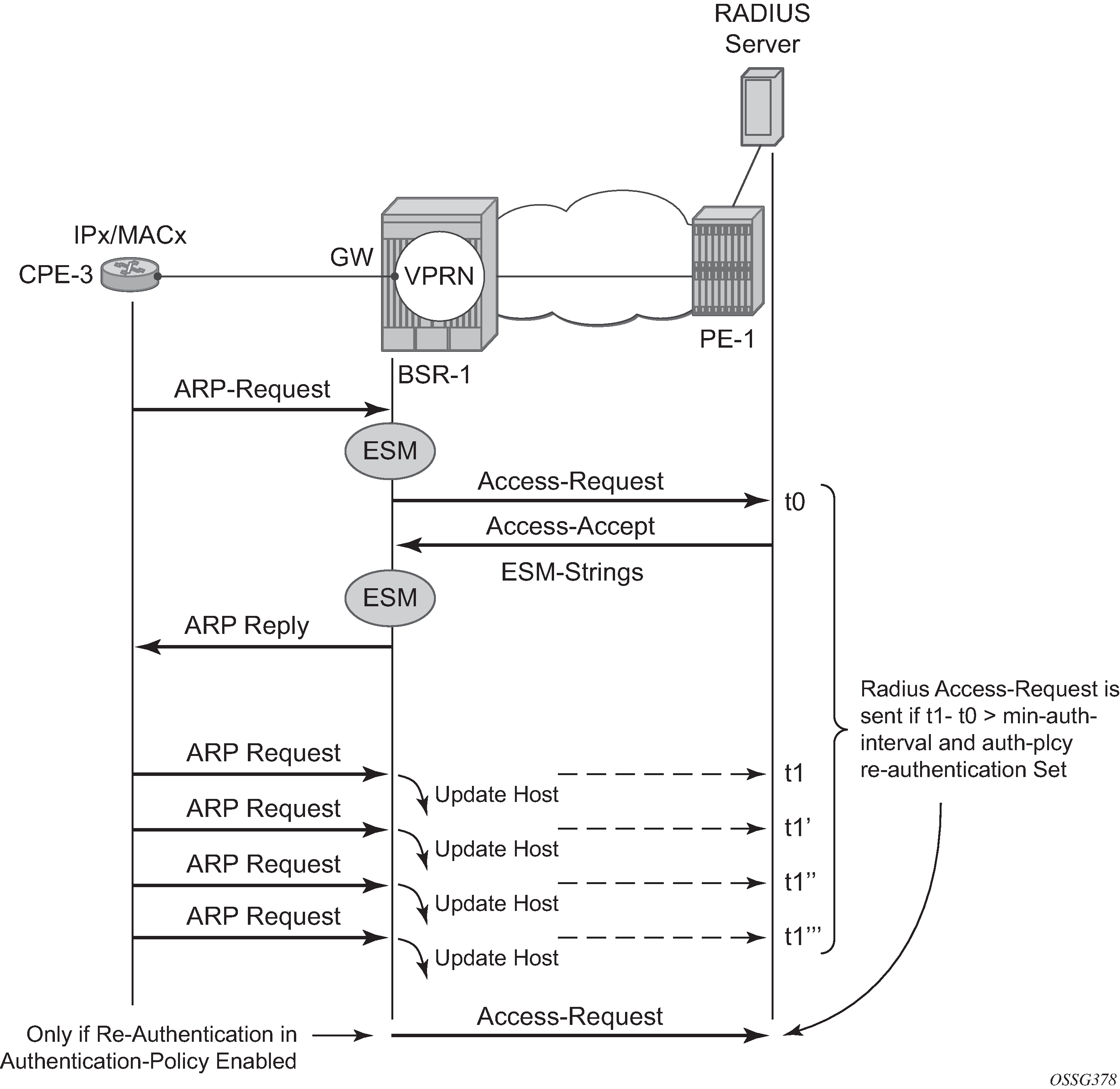 The CPE ARPs are snooped and the first CPE ARP triggers a RADIUS accept-request. Any subsequent ARPs will trigger RADIUS re-authentication only if the ARP host configurable min-auth-interval is expired and if the previously defined re-authentication parameter is set. The initial ARP is only forwarded to the BSR-1 upon successful RADIUS authentication by means of a RADIUS access-accept message. The same RADIUS access-accept message and passing the several session limit checks, triggers the instanciation of the host.