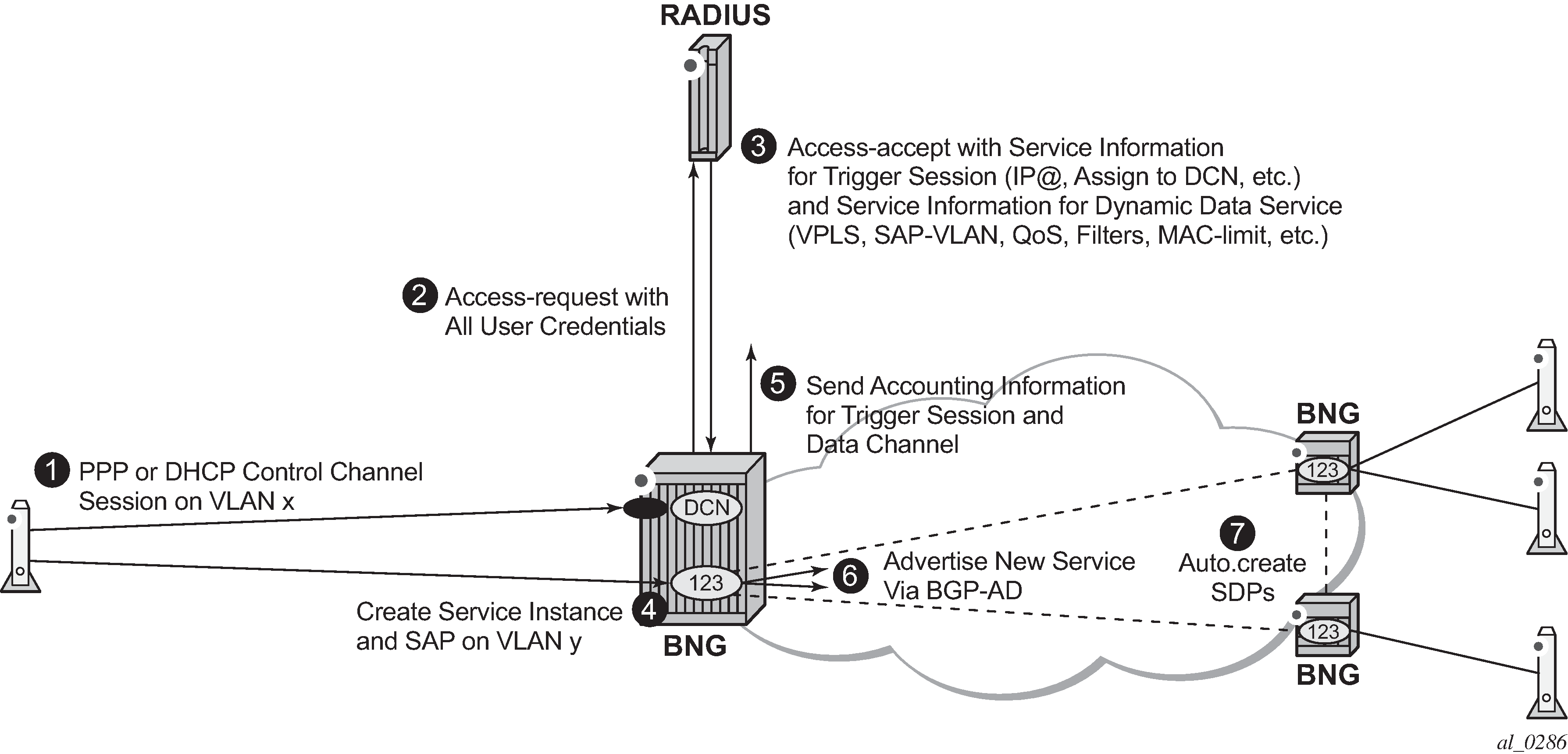 Triggered by the authentication of a single or dual stack PPPoE or IPoE session or a single stack IPv4 host as the ‟control channel” from the business CPE, parameters are passed in a RADIUS Access Accept or Change of Authorization (CoA) message to set up one or multiple Layer 2 or Layer 3 data services.