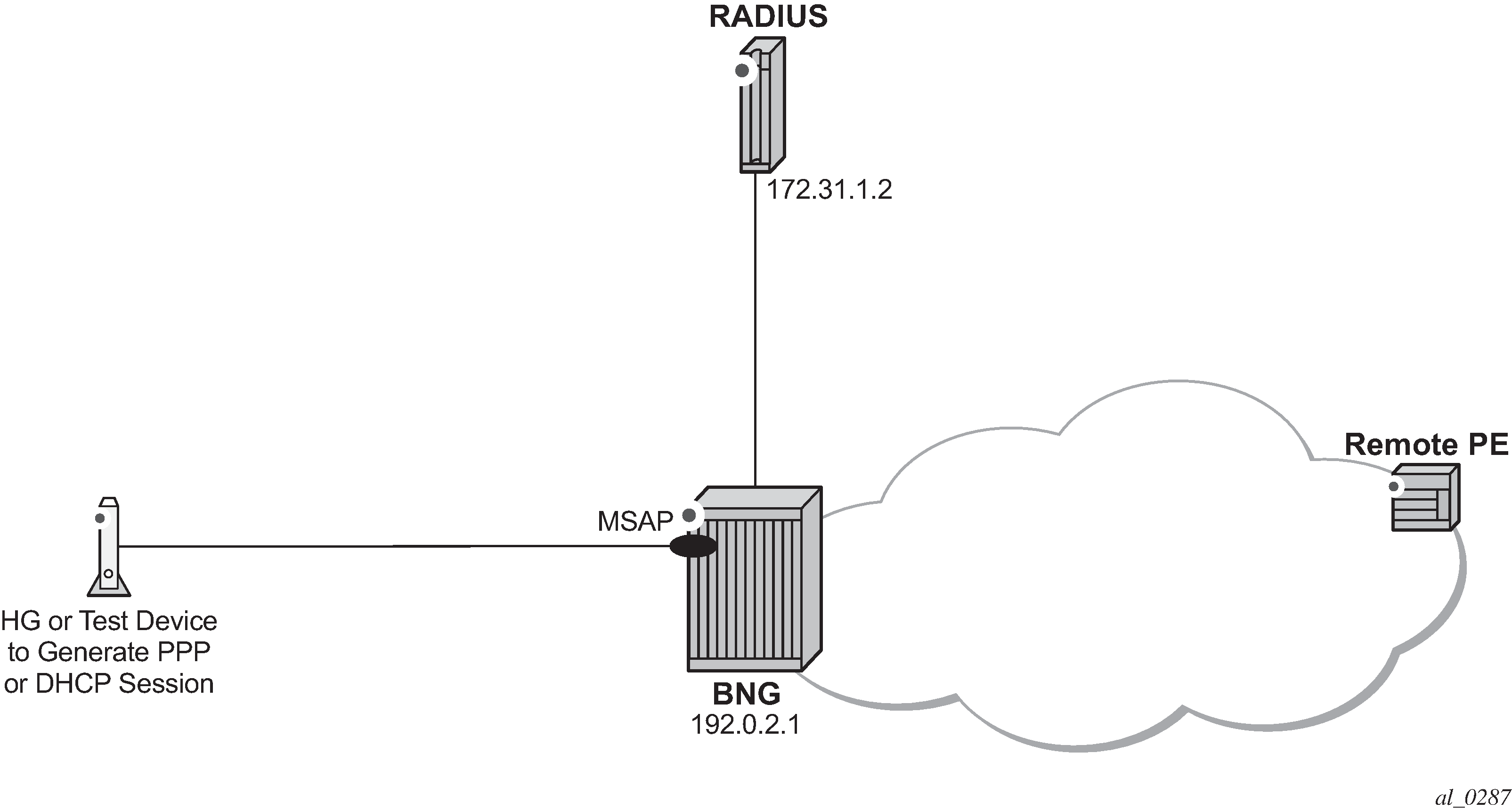The pure service setup can be tested with a single node acting as BNG. However an Epipe service between two nodes will not normally become status ‟up” with only one endpoint in an up state. As such, for packets should be sent through the established dynamic data service, a remote PE could also be configured. The remote PE could have its data service configured in a regular fashion, meaning via CLI/SNMP or 5620 SAM.
