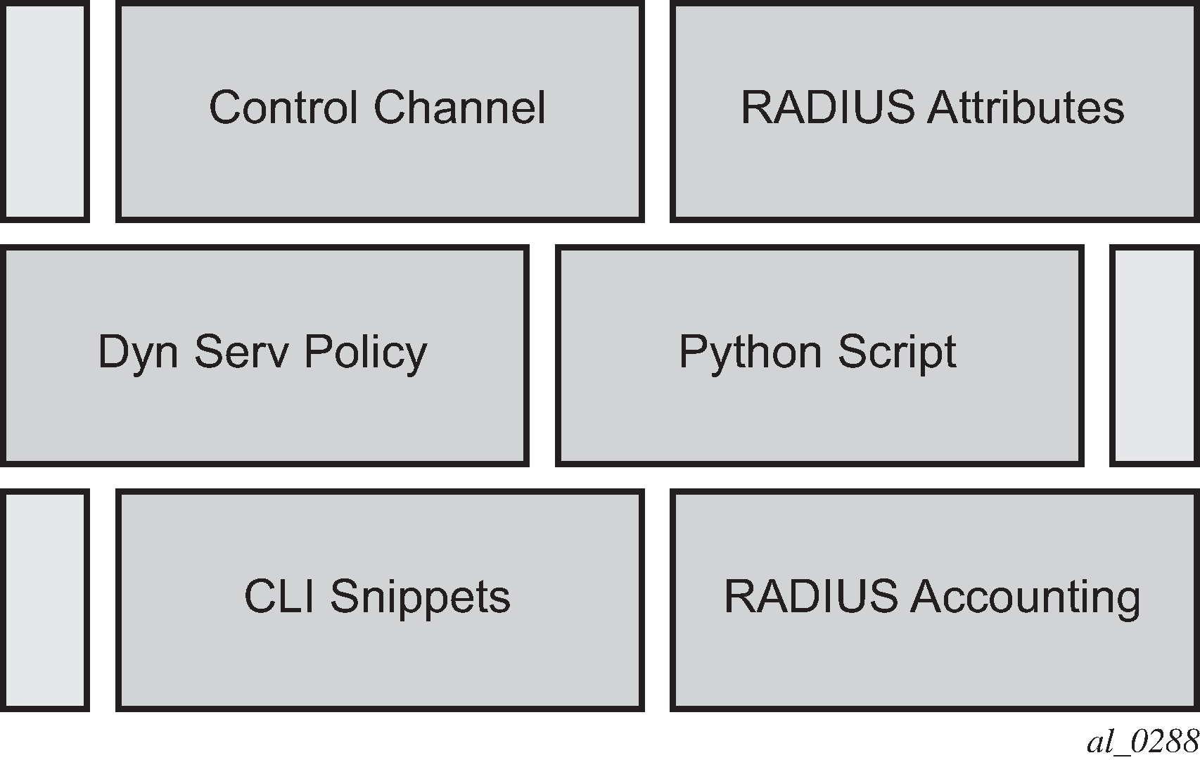 Based on a PPP or DHCP control session, RADIUS will return the required parameters for the dynamic data service via dedicated Vendor Specific Attributes (VSAs). The existence of those attributes in the RADIUS Accept message will trigger the relaying of the parameters relating to those attributes towards the Python script defined in the dynamic service policy, which will process them to generate the regular CLI output for the various service types (IES, VPRN, Epipe, VPLS).