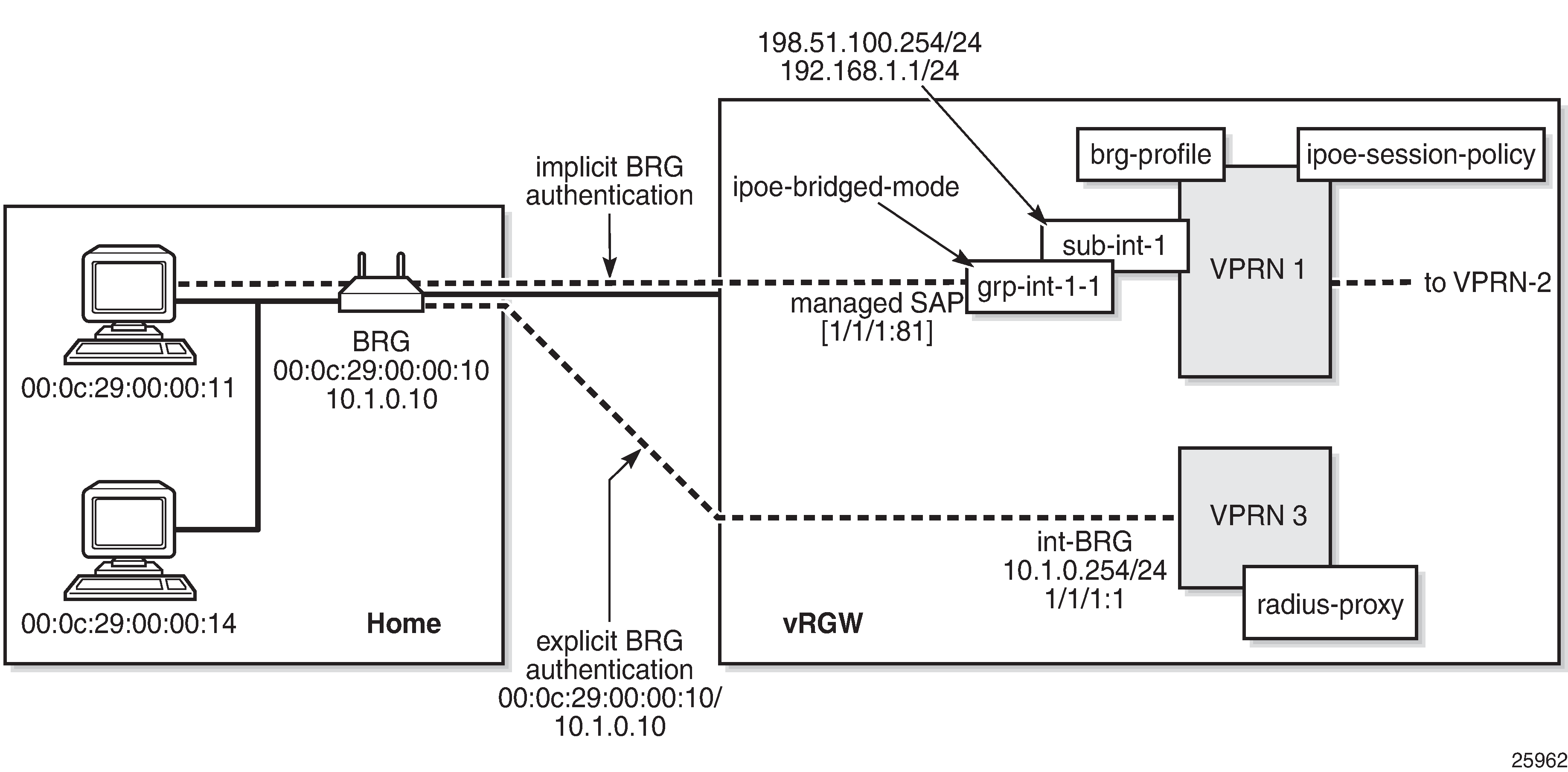 The services configuration shown in Example service configuration for explicit and implicit BRG authentication applies to the examples throughout this chapter. Because the main focus of this chapter is on BRG and home device authentication, the detailed configuration of VPLS 10 containing the capture SAP and of VPRN-2 containing the outside L2-aware NAT range is not repeated here. See the Virtual Residential Gateway Home Pool Management chapter for those configurations.