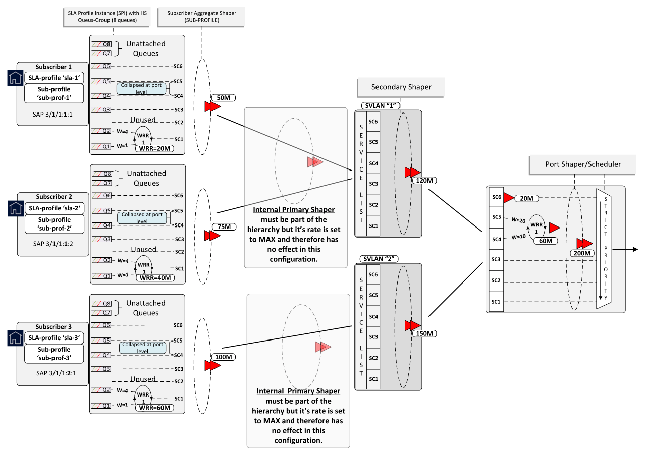 All three subscribers share the same HS attachment policy. This means that the mapping between the queues, scheduling classes (SC), and WRR groups is the same for all three subscribers.