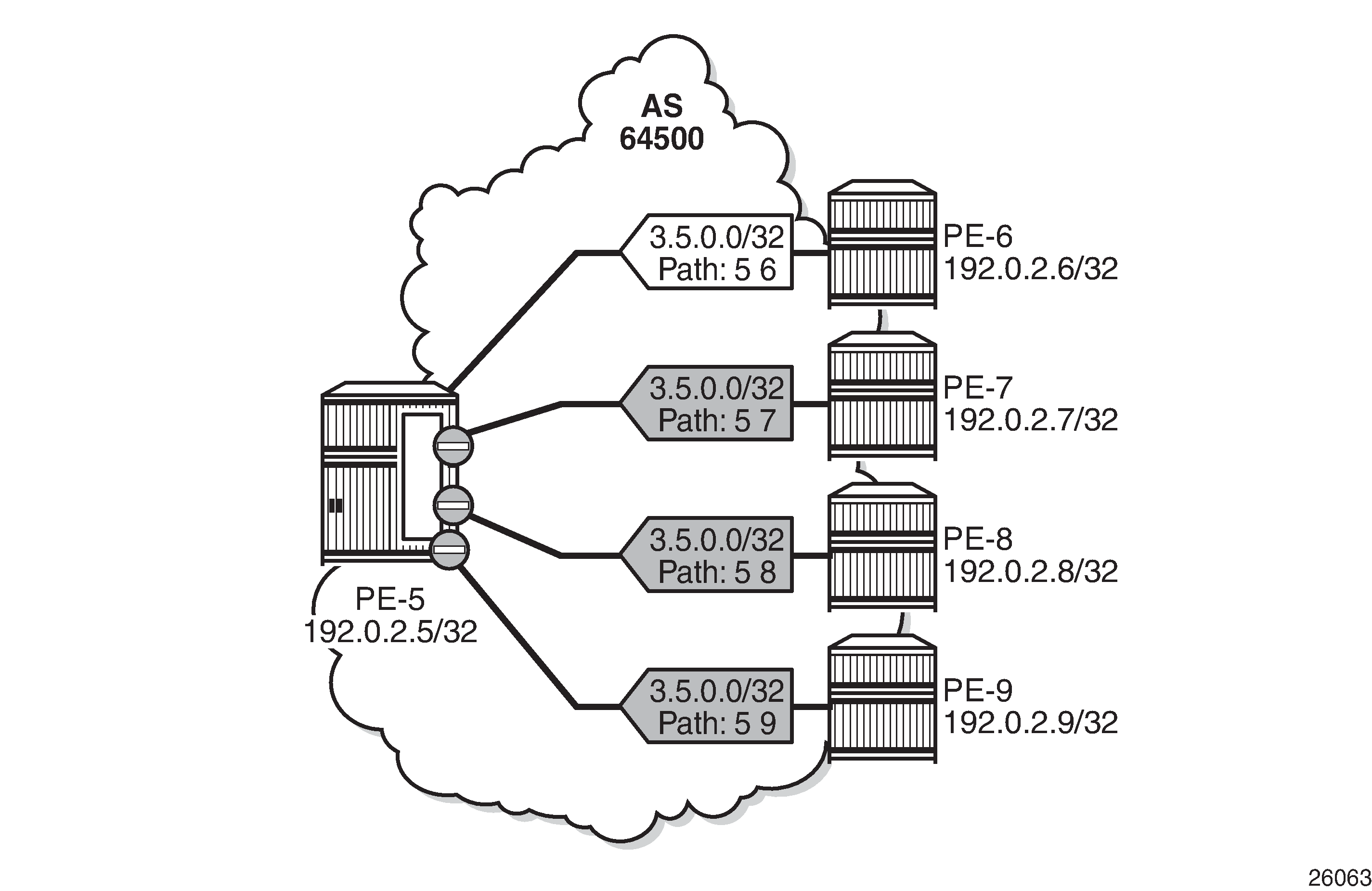 The four iBGP neighbors advertise prefixes 3.5.0.0/32 and 3.6.0.0/32 to PE-5, see BGP multipath restricted to exact same AS. All AS paths are different. and BGP multipath restricted to exact same AS. All AS paths are identical. The AS paths for prefix 3.5.0.0/32 are not identical, but the neighbor AS is the same, and the AS path is of equal length. The AS paths for prefix 3.6.0.0/32 are identical.