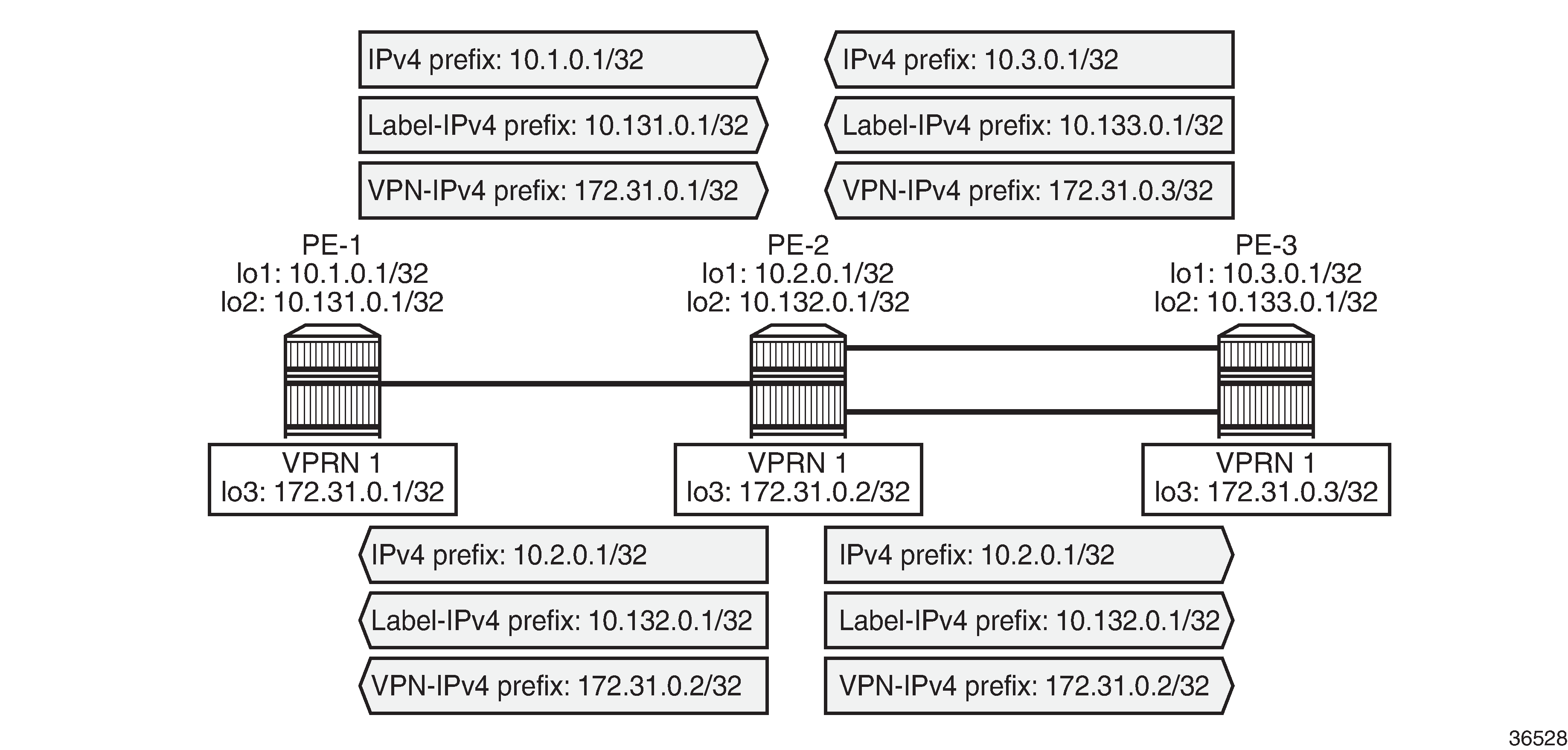 In the example, IPv4, label-IPv4, and VPN-IPv4 routes are advertised with an IPv6 next-hop. On PE-1, loopback interfaces lo1 (10.1.0.1/32) and lo2 (10.131.0.1/32) are configured; lo1 is advertised as an IPv4 route and lo2 as a label-IPv4 route. VPRN 1 is configured on all nodes with loopback interface lo3, and prefix 172.31.0.1/32 is advertised as a VPN-IPv4 route on PE-1. PE-2 and PE-3 have similar loopback interfaces. Loopback addresses and advertised IPv4, label-IPv4, and VPN-IPv4 routes shows the loopback addresses and the advertised routes.