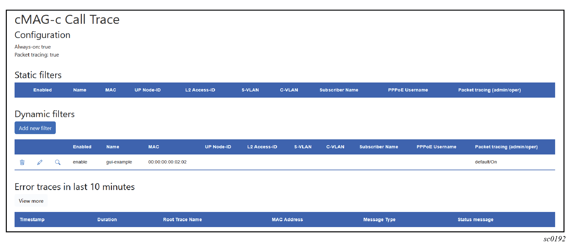 The cMAG-c provides session filters with configurable options for matching the sessions to trace. You can use the CLI or the cMAG-c Call Trace GUI tool to manage filters for session tracing.